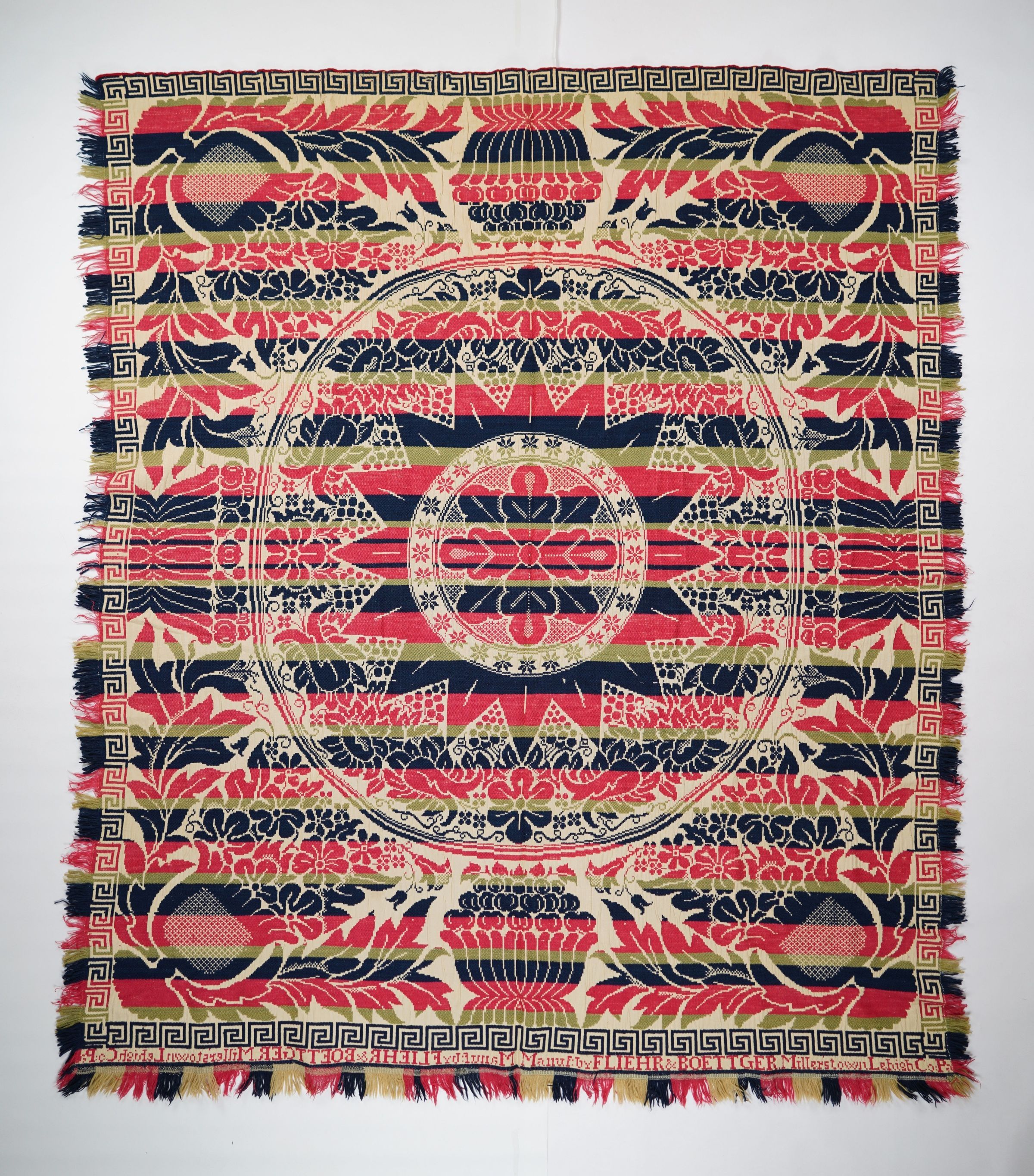 Red, green, navy, and natural figured half doublecloth center medallion coverlet with fringe on three sides. Seamless. Woven by Charles B. Fliehr and Carl Boettger in Millerstown (now Macungie), Lehigh Co., Pennsylvania.Collection