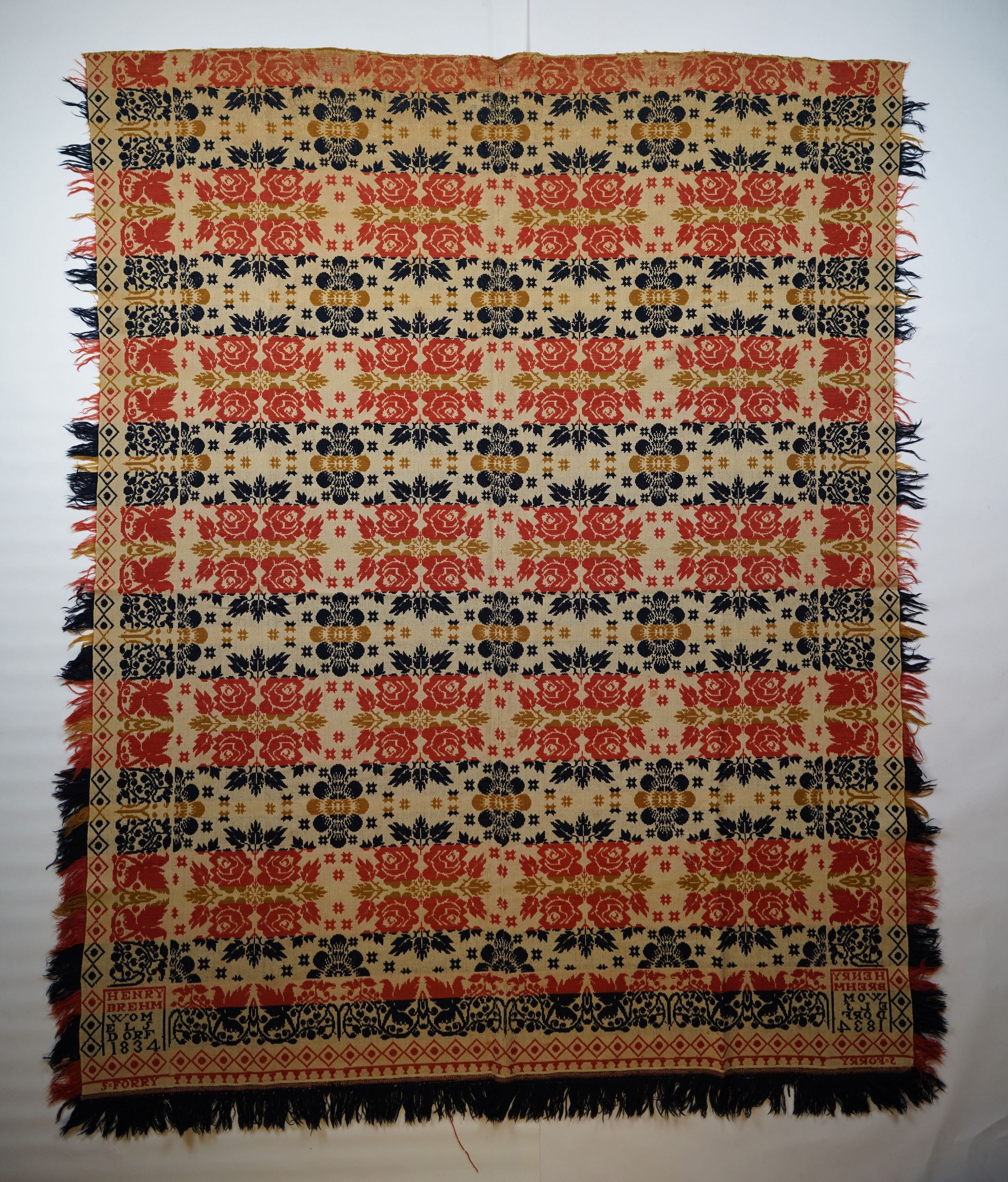 Yellow, red, navy, and natural figured tied half doublecloth coverlet with border and fringe on three sides. Two joined panels. Woven for S. Forry by Henry Brehm in Womelsdorf, Berks Co., Pennsylvania.Collection