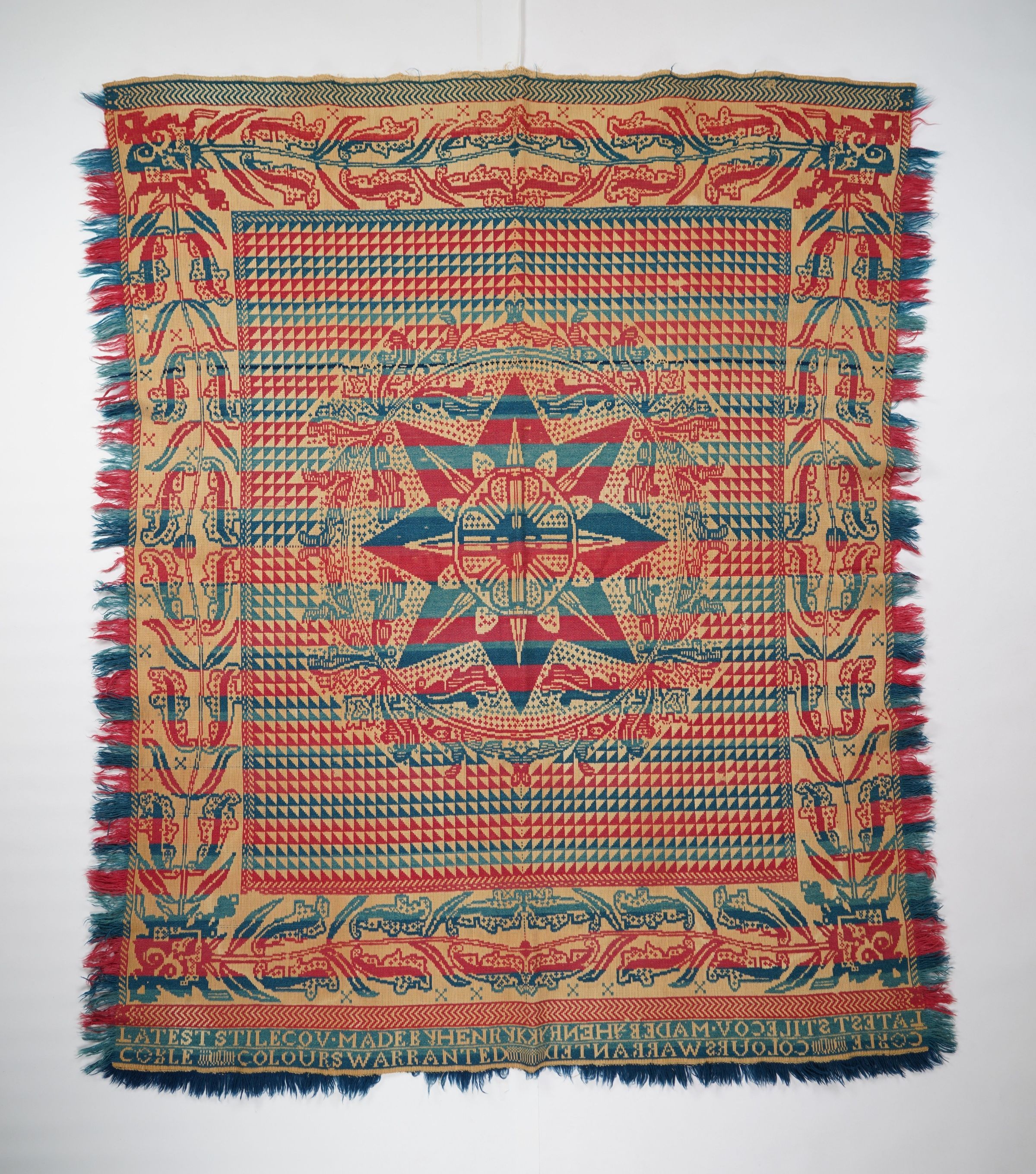 Red, blue, navy, and natural figured coverlet with border on four sides and fringe on three sides. Two joined panels. Woven by Henry Coble in Lancaster Co., Pennsylvania.Collection