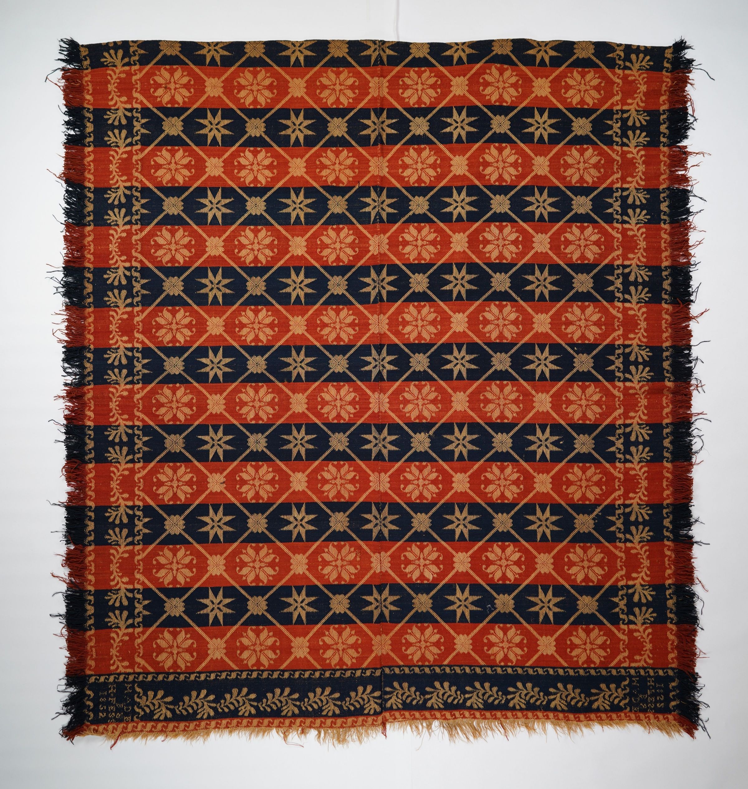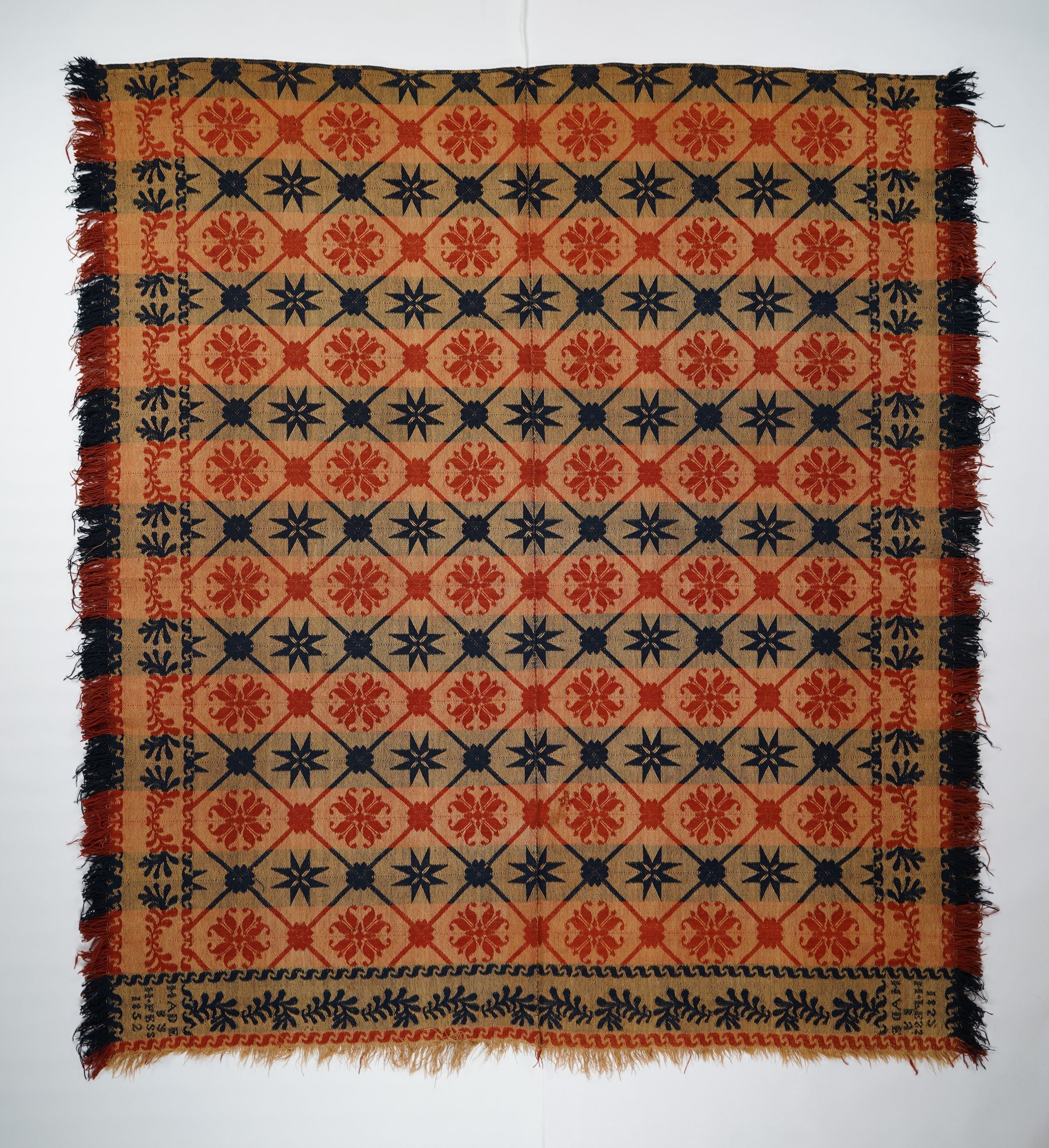 Red, navy, and natural figured coverlet with border and self-fringe on three sides. Woven by Henry Fess in Westmoreland Co., Pennsylvania in 1852.Collection