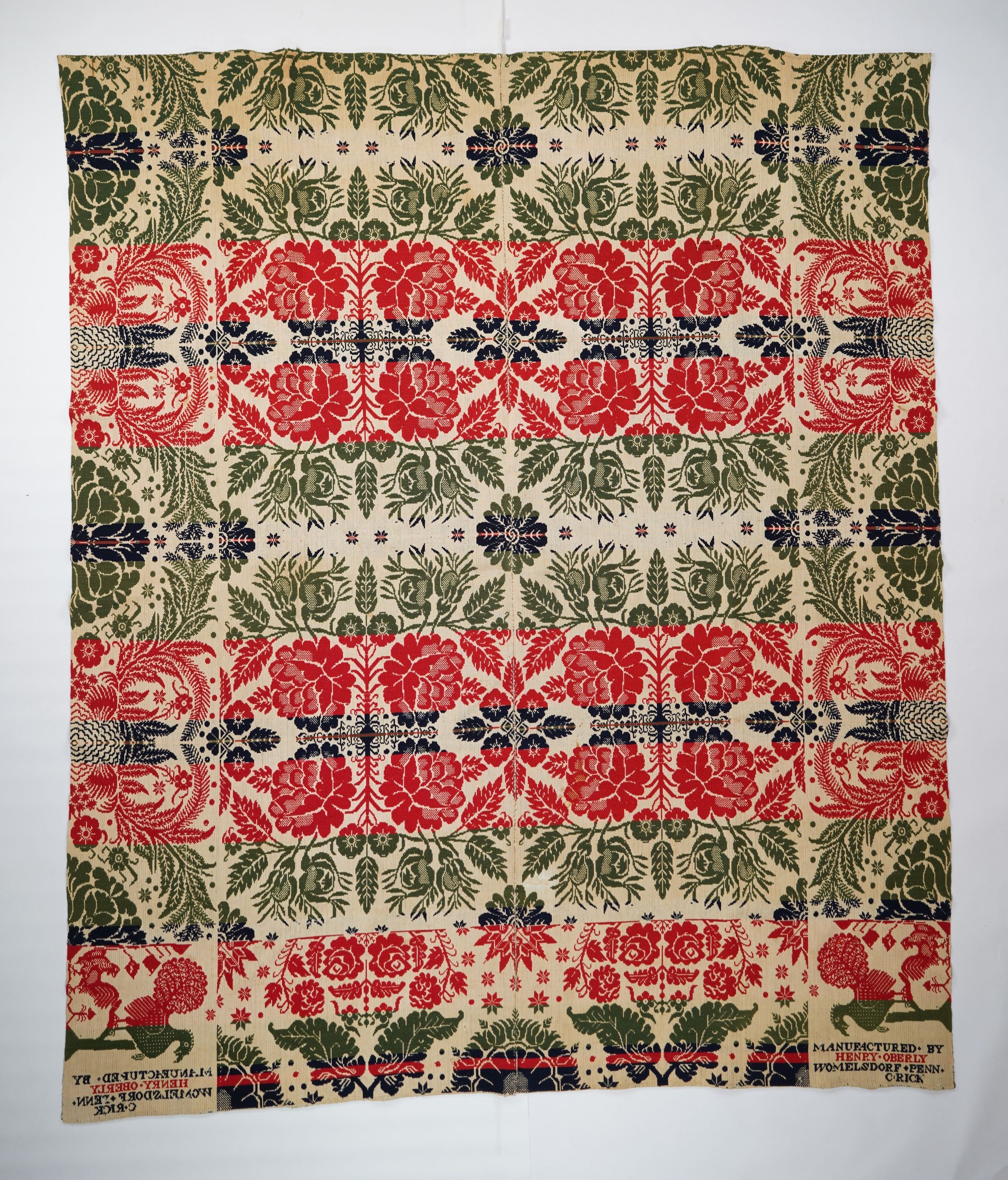 Red, green, navy, and natural figured tied half doublecloth coverlet with border on three sides. Two joined panels. Woven for C. Rick by Henry Oberly in Womelsdorf, Berks Co., Pennsylvania.Collection