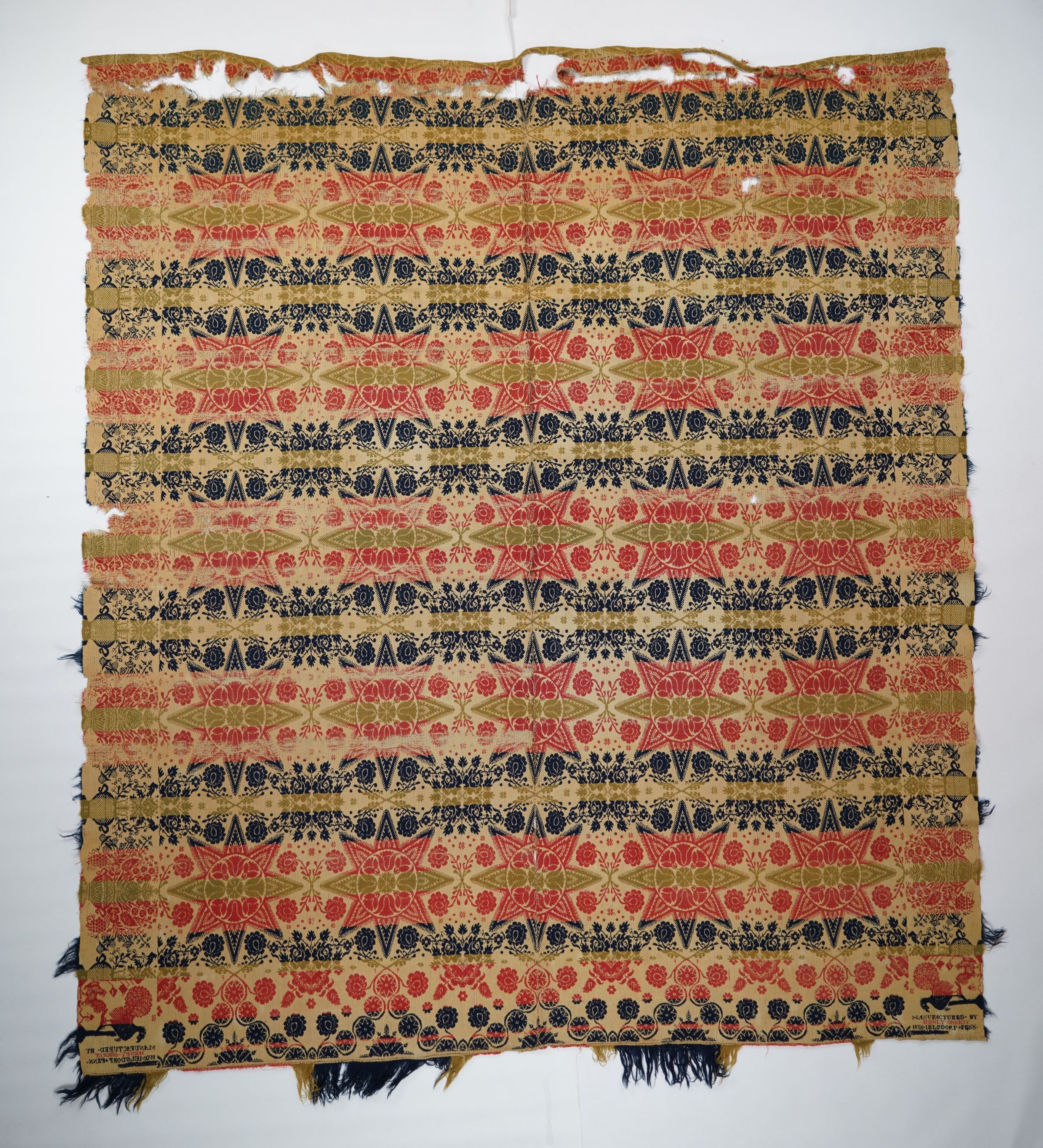 Green, red, navy, and natural figured tied half doublecloth coverlet with border and fringe on three sides. Two joined panels. Woven by Henry Oberly in Womelsdorf, Berks Co., Pennsylvania.Collection