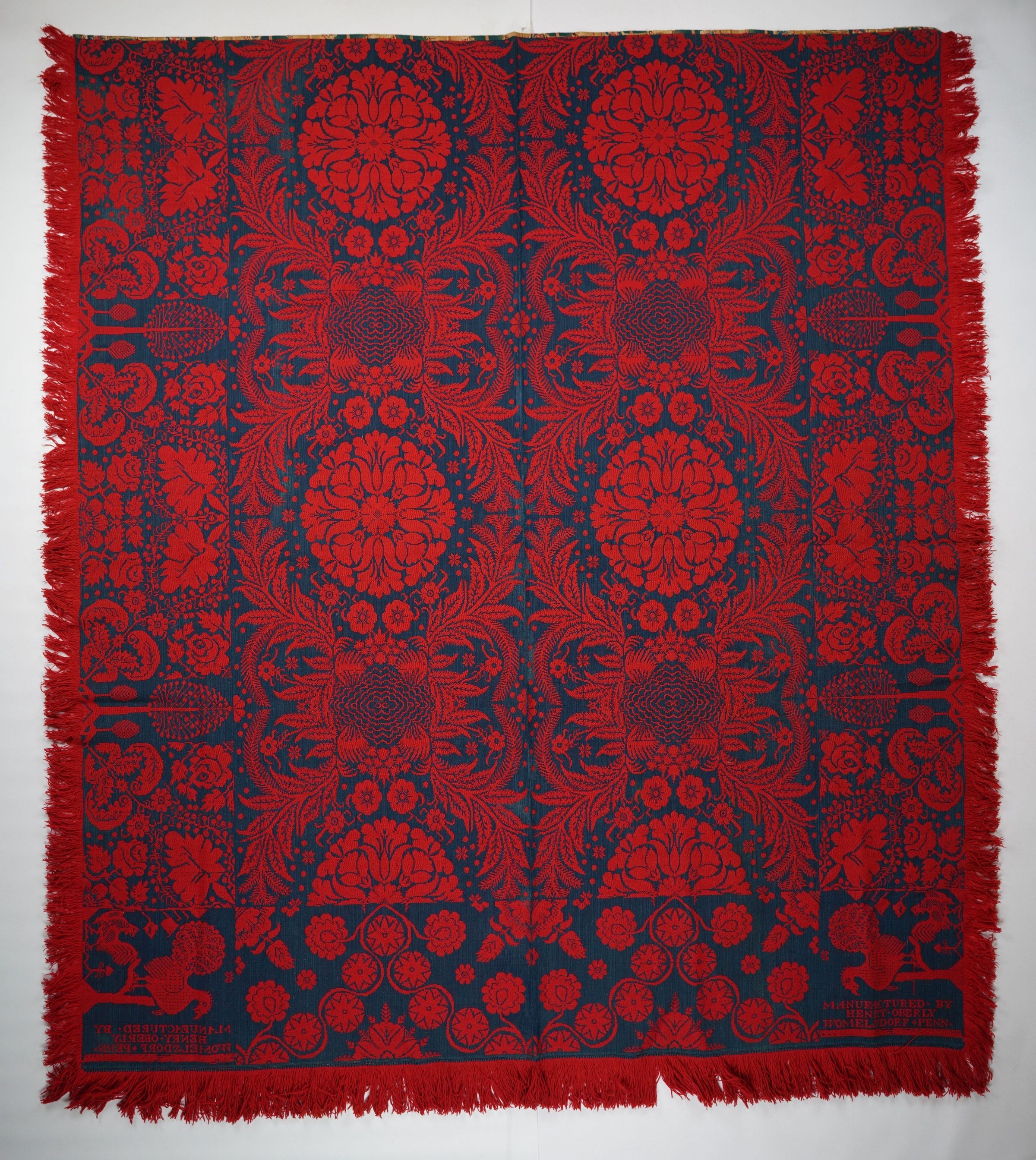 Navy and red figured tied half doublecloth coverlet with border and fringe on three sides. Two joined panels. Woven by Henry Oberly in Womelsdorf, Berks Co., Pennsylvania.Collection