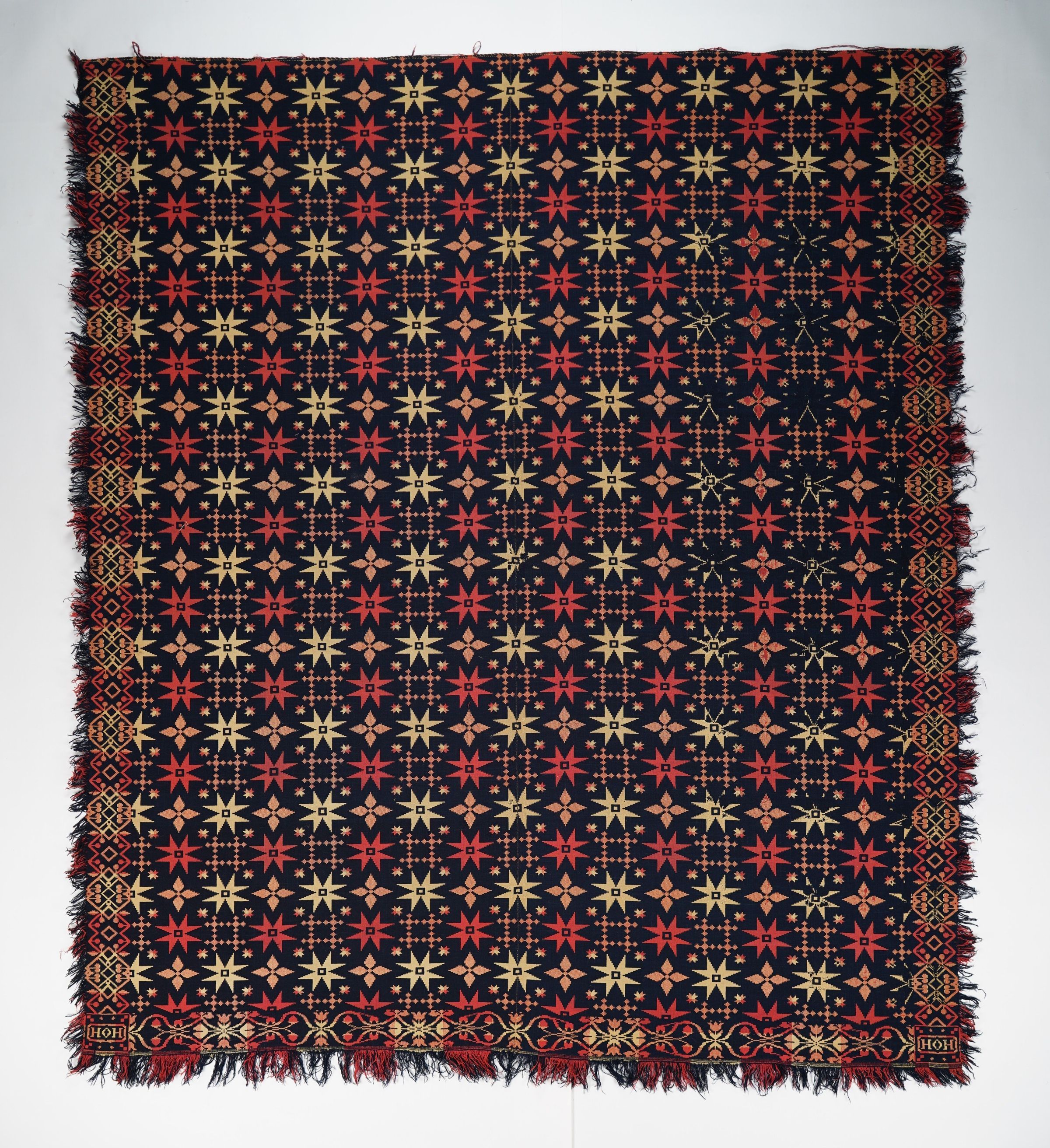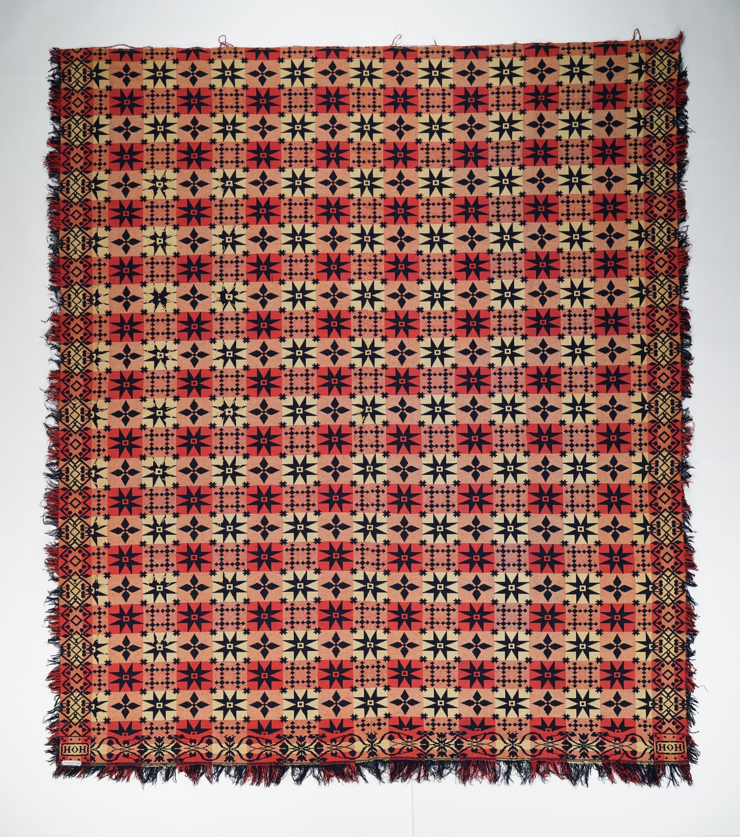 Red, navy blue, and natural figured doubleweave coverlet with borders and self-fringe on three sides. Geometric pattern with fancy borders. Henry Overholt was known to weave this uncommon pattern, which he signed with his full name in other coverlets.Photograph Details