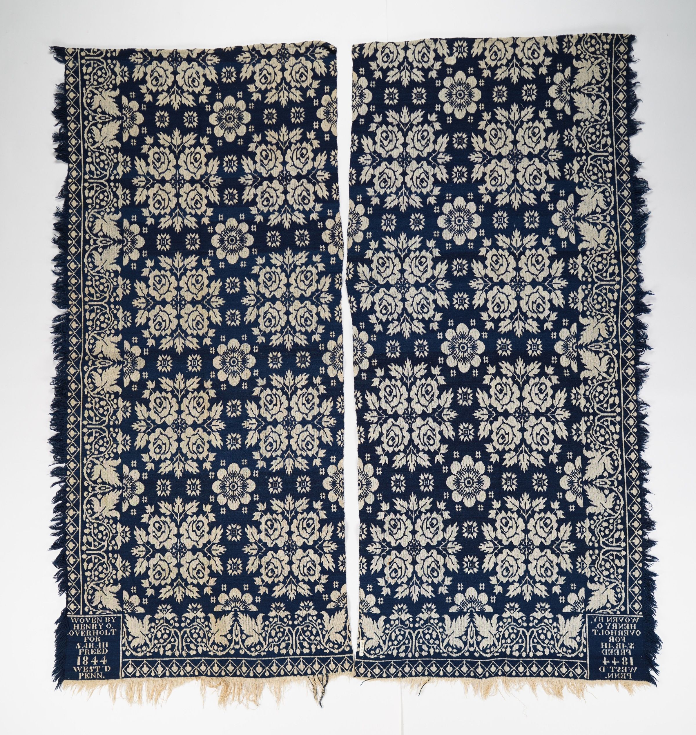 Navy blue and natural figured tied Beiderwand coverlet; grapevine borders and self-fringe on three sides. Woven by Henry O. Overholt for Sarah Freed.Photograph Details