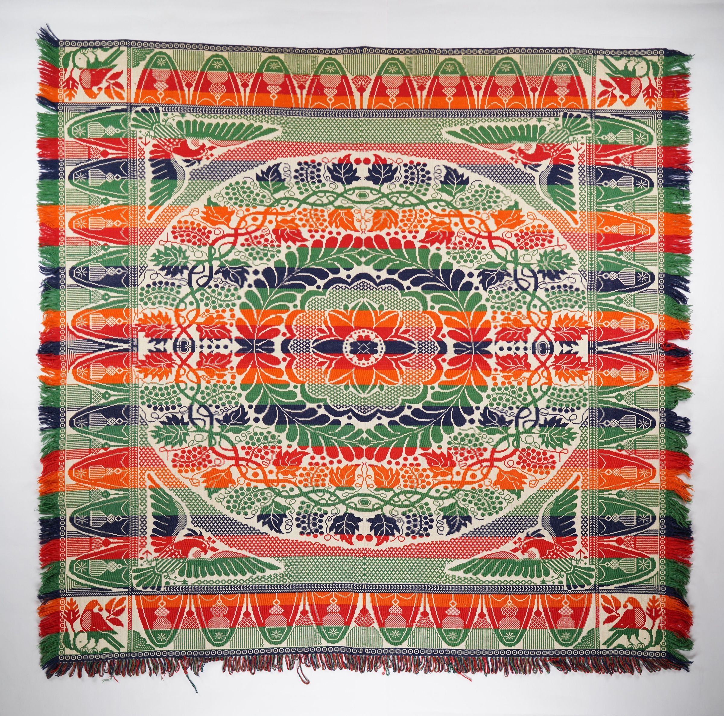 Red, orange, green, purple, and natural figured true beiderwand center medallion coverlet with fringe on three sides. Seamless.Context