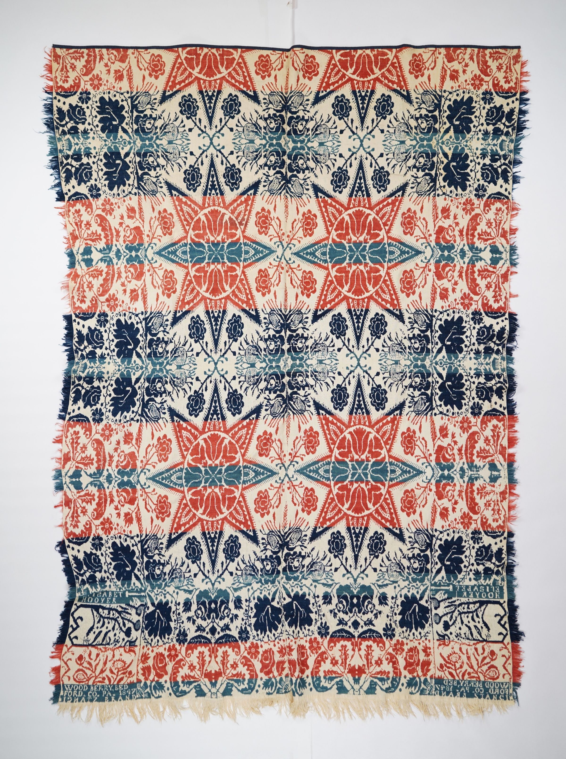 Red, blue, navy, and natural figured tied half doublecloth coverlet with border and self-fringe on three sides. Two joined panels. Woven for Elisabeth Hoover by Ignatz Brand in Woodbury, Bedford Co., Pennsylvania in 1847.Collection
