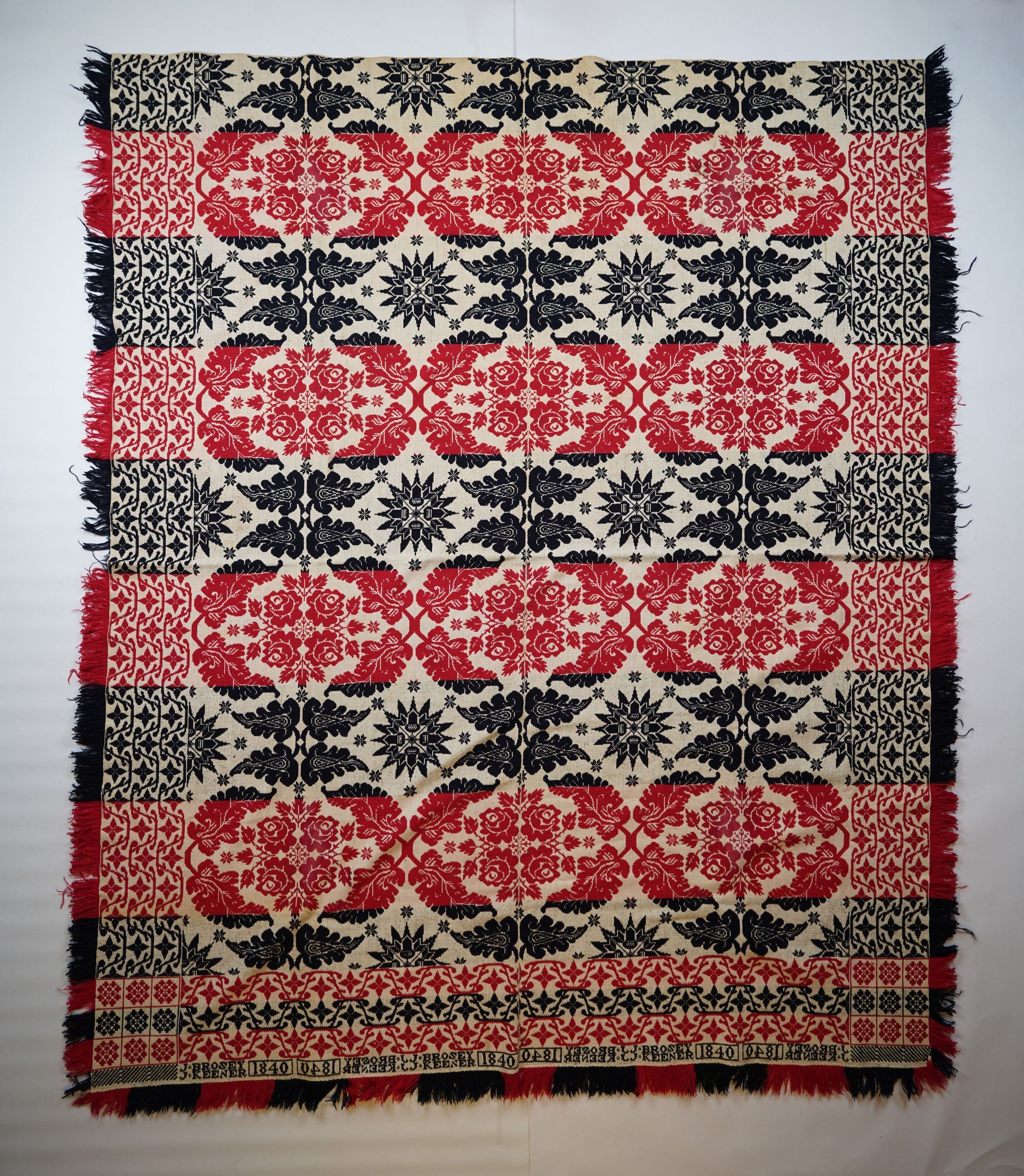 Red, navy, and natural figured tied half doublecloth coverlet with border and fringe on three sides. Two joined panels. Woven for J. Keener by John Brosey in Lancaster Co., Pennsylvania in 1840.Collection