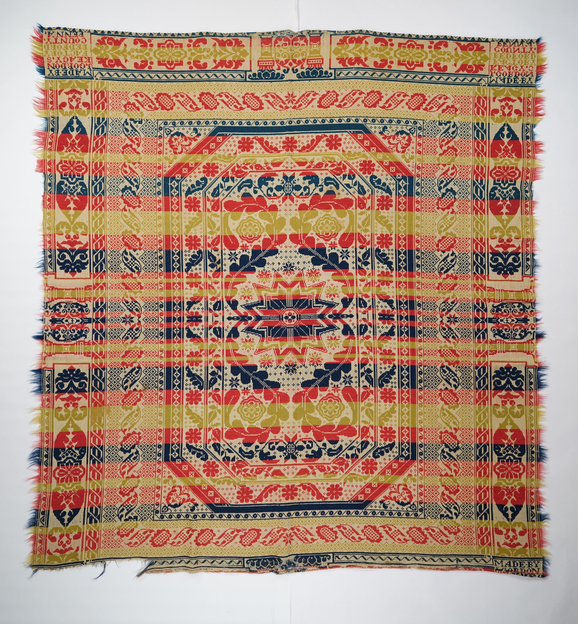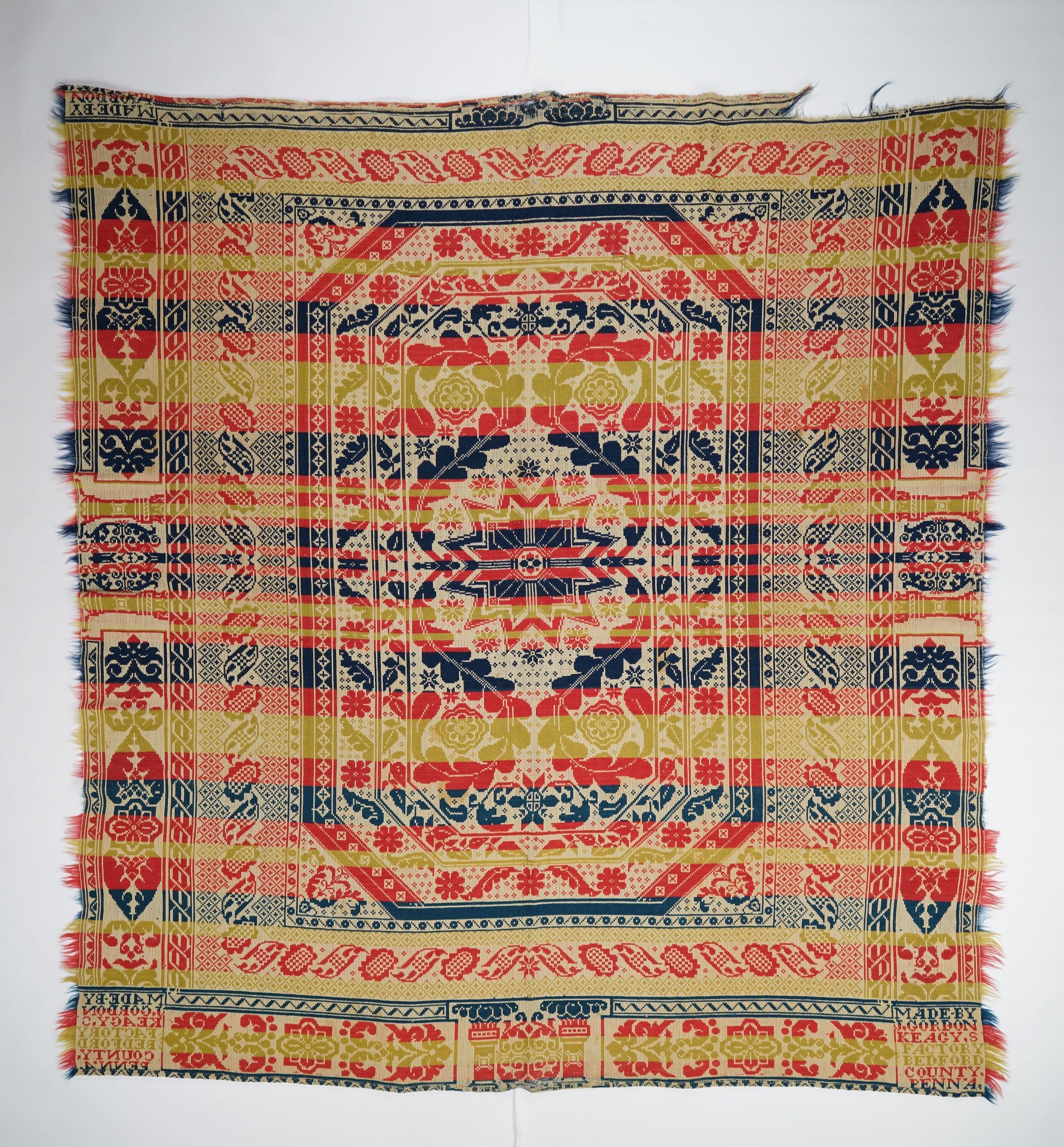 Red, yellow, navy, and natural figured tied half doublecloth coverlet with border on three sides and self-fringe on two sides. Seamless. Woven by J. Gordon at the Keagy Globe Factory in Bedford Co., Pennsylvania.Collection