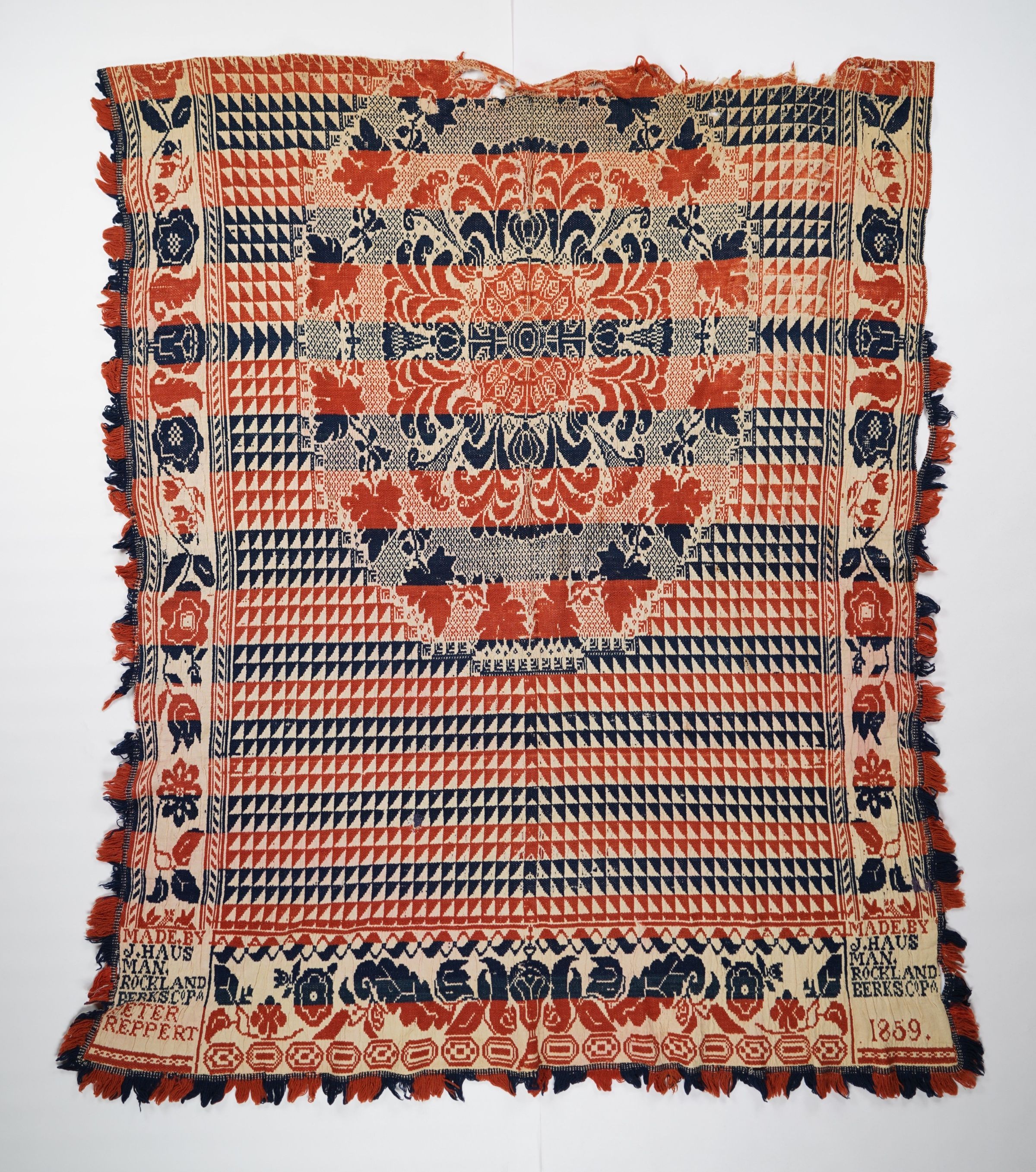 Red, navy, and natural figured half doublecloth coverlet with border and applied fringe on three sides. Seamless. Woven for Peter Reppert by Jacob Mosher Hausman in Rockland Twp., Berks Co., Pennsylvania in 1859.Collection