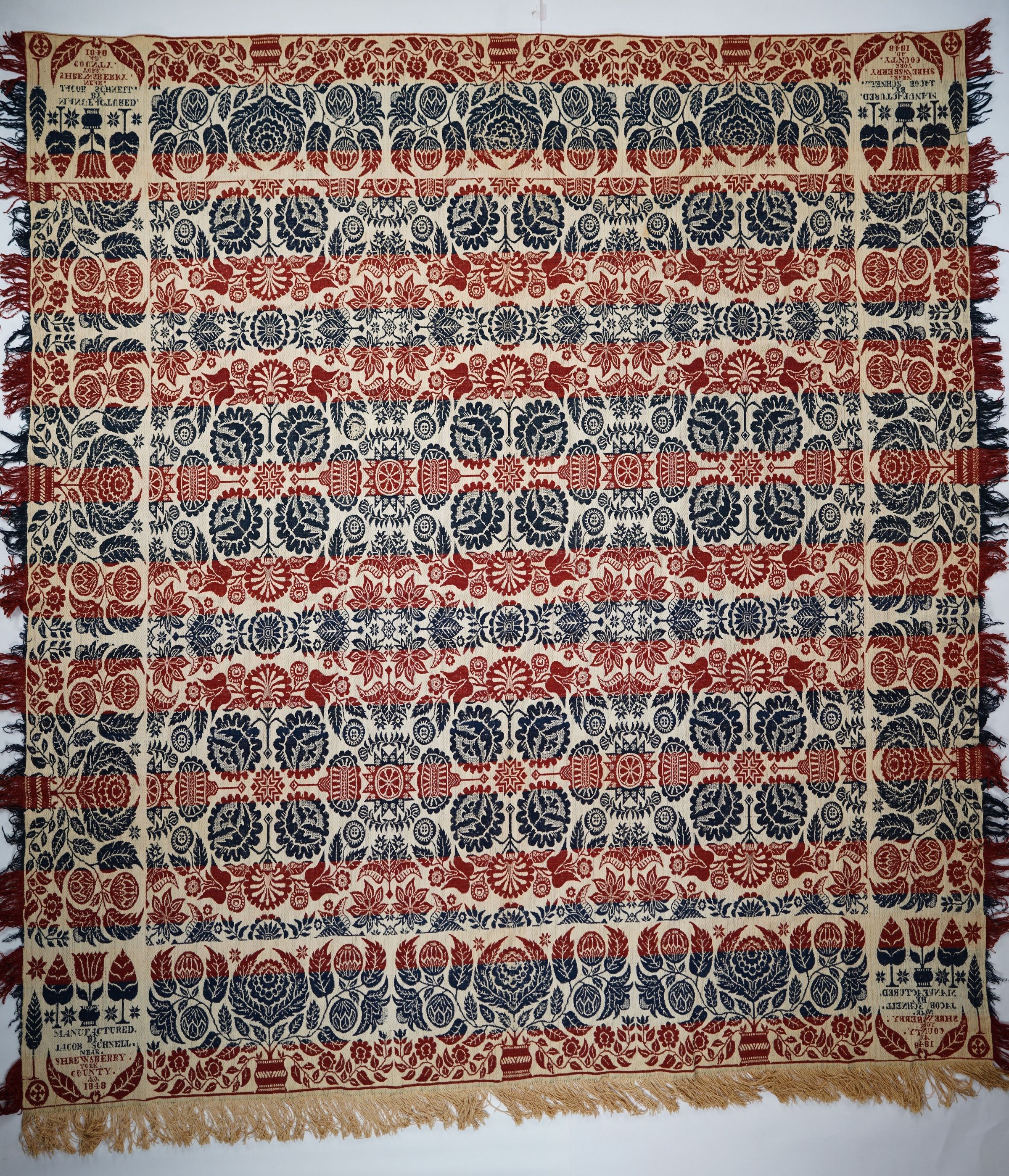Red, navy, and natural figured tied half doublecloth coverlet with border on four sides and self-fringe on three sides. Seamless. Woven by Jacob Schnell near Shrewsberry, York Co., Pennsylvania in 1848.Collection