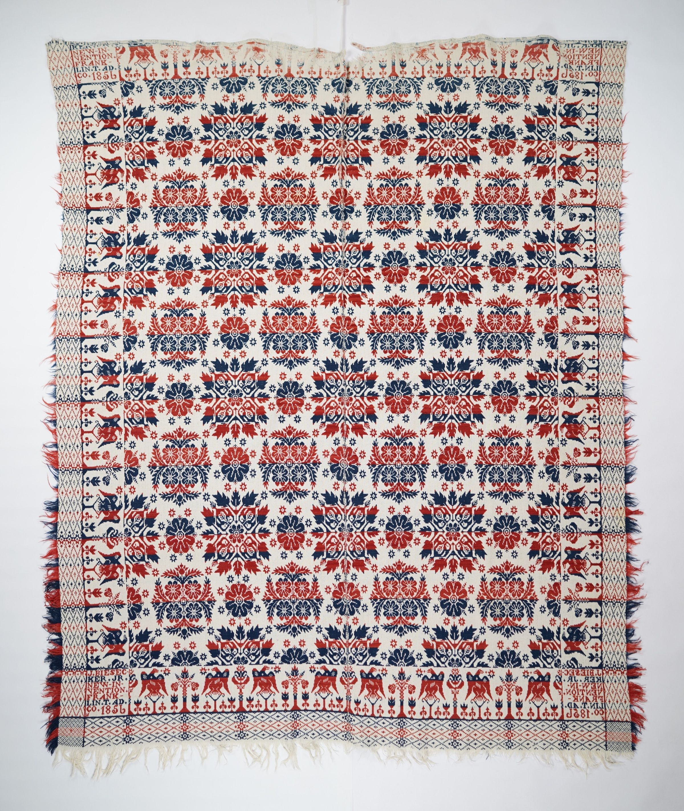 Red, navy, and natural figured tied half doublecloth coverlet with border on four sides. and self-fringe on three sides. Two joined panels. Woven by James Biesecker Jr. in Franklin Twp., Adams Co., Pennsylvania in 1856.Collection