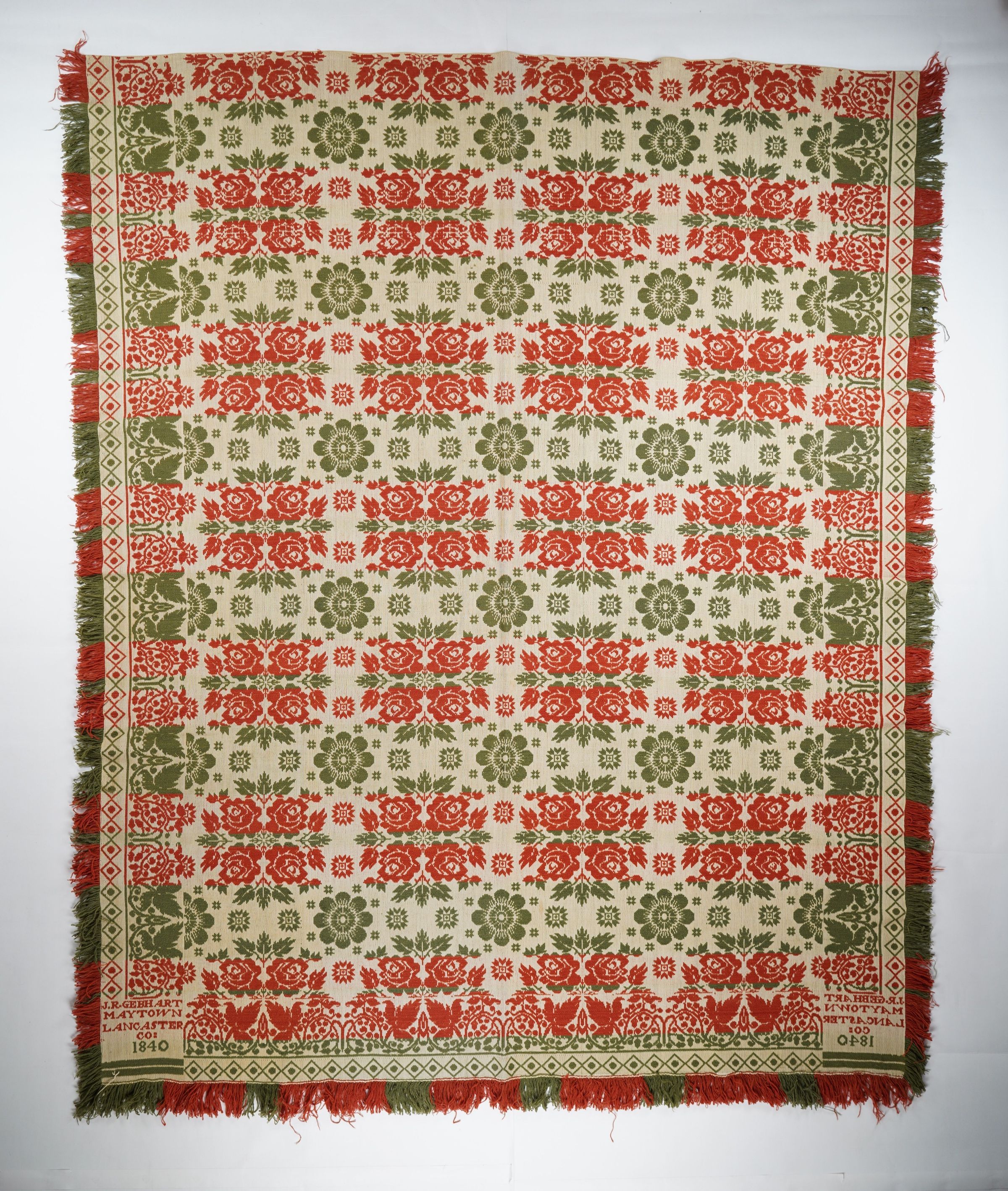 Figured and fancy tied beiderwand coverlet with borders on 3 sides and self-fringe on the sides and applied fringe on the bottom. Woven full-width; seamless. Red and green wool with undyed cotton. Double rose centerfield pattern; grapevine border on sides and bottom. Woven by John Gebhart in 1840.Context