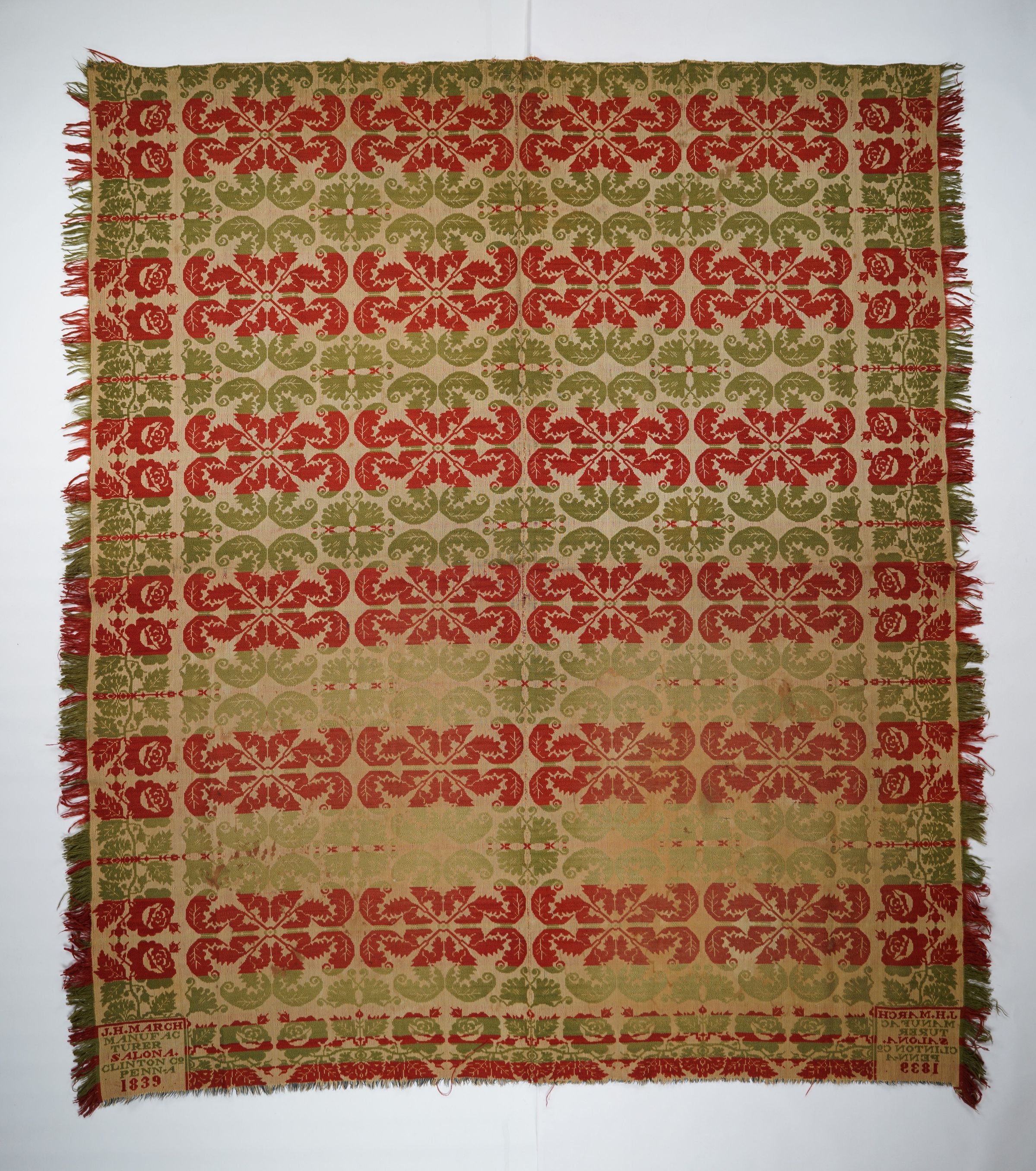 Red, green, and natural figured tied half doublecloth coverlet with border and self-fringe on three sides. Two joined panels. Woven by John Henry March in Salona, Clinton Co., Pennsylvania in 1839.Collection