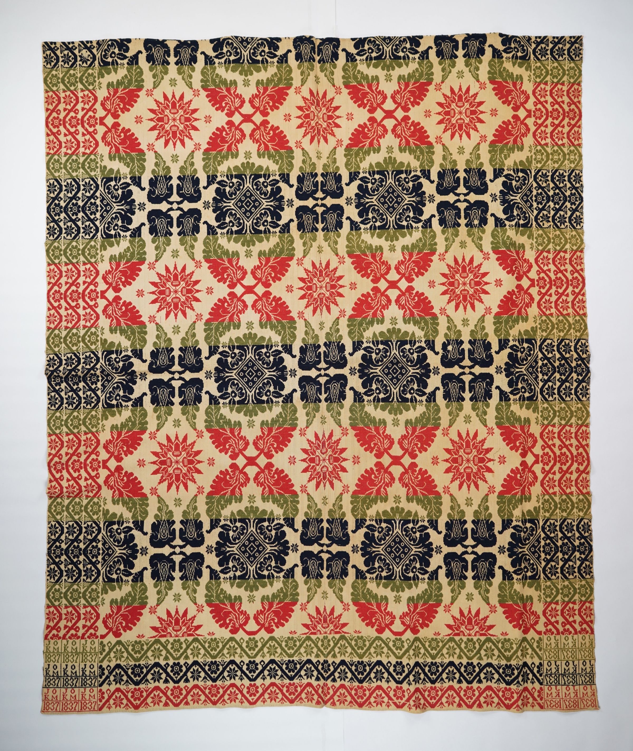 Red, green, navy, and natural figured tied half doublecloth coverlet with border on three sides. Two joined panels. Woven by John Kaufman in Hilltown Twp., Bucks Co., Pennsylvania in 1837.Collection