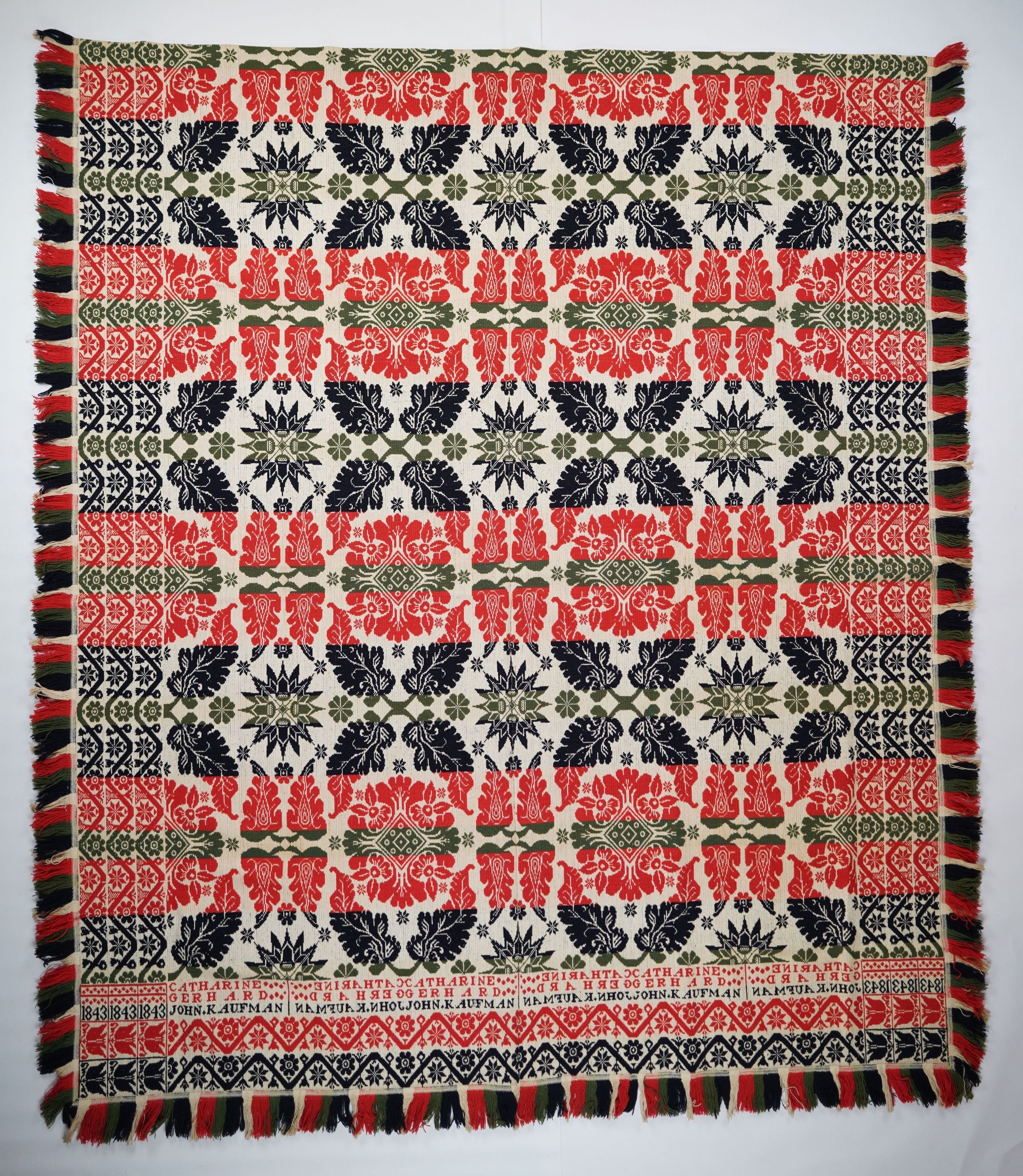 Green, red, navy, and natural figured tied half doublecloth coverlet with border and applied fringe on three sides. Two joined panels. Woven for Catharine Gearhard by John Kaufman in Pennsylvania in 1843.Collection