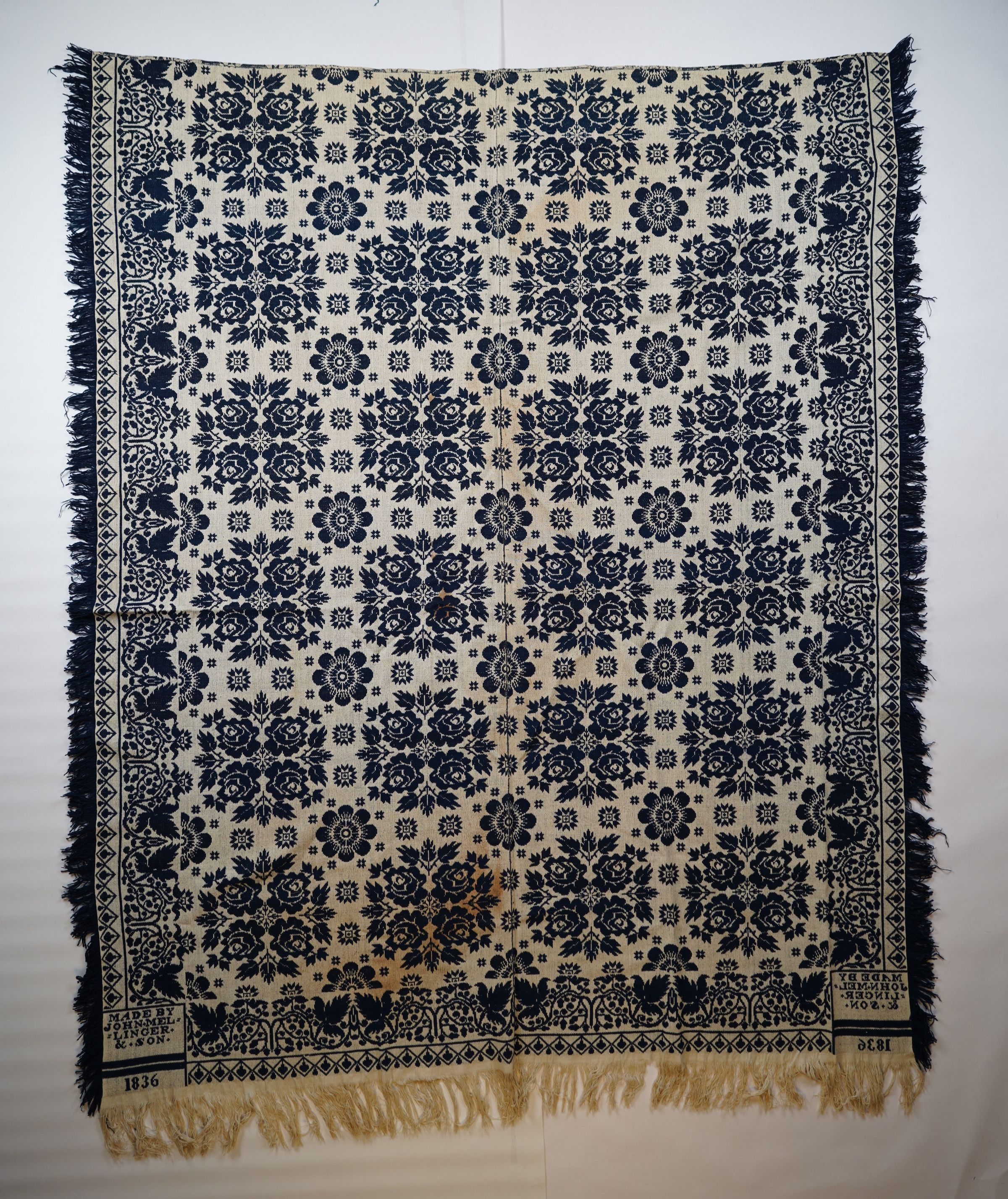 Navy and natural figured tied half doublecloth coverlet with border and self-fringe on three sides. Two joined panels. Woven by John Mellinger & Son in Pennsylvania in 1836.Collection