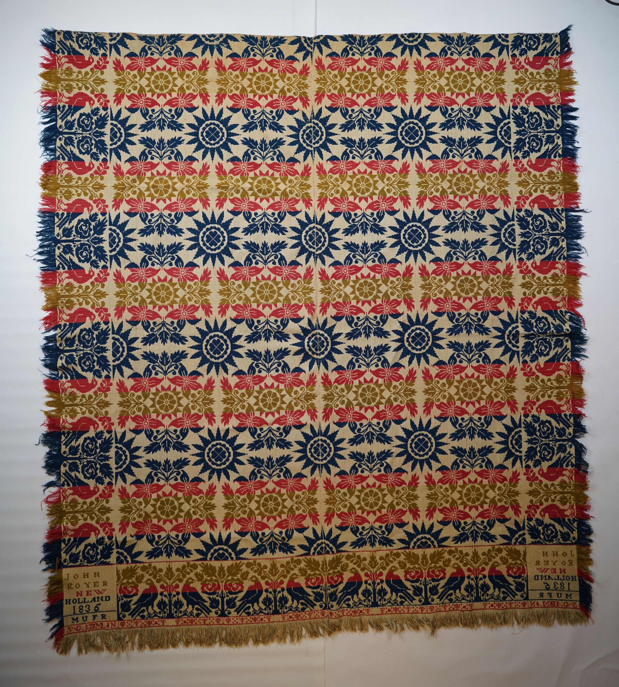 Yellow, red, navy, and natural figured tied half doublecloth coverlet with border and self-fringe on three sides. Two joined panels. Woven for S. Gadman by John Royer in New Holland, Lancaster Co., Pennsylvania in 1836.Collection