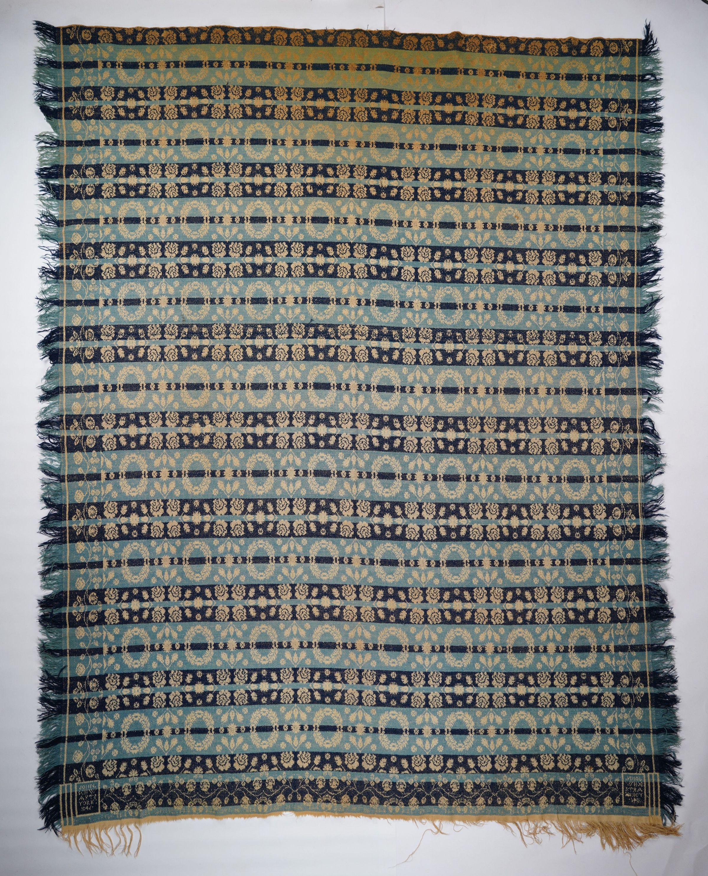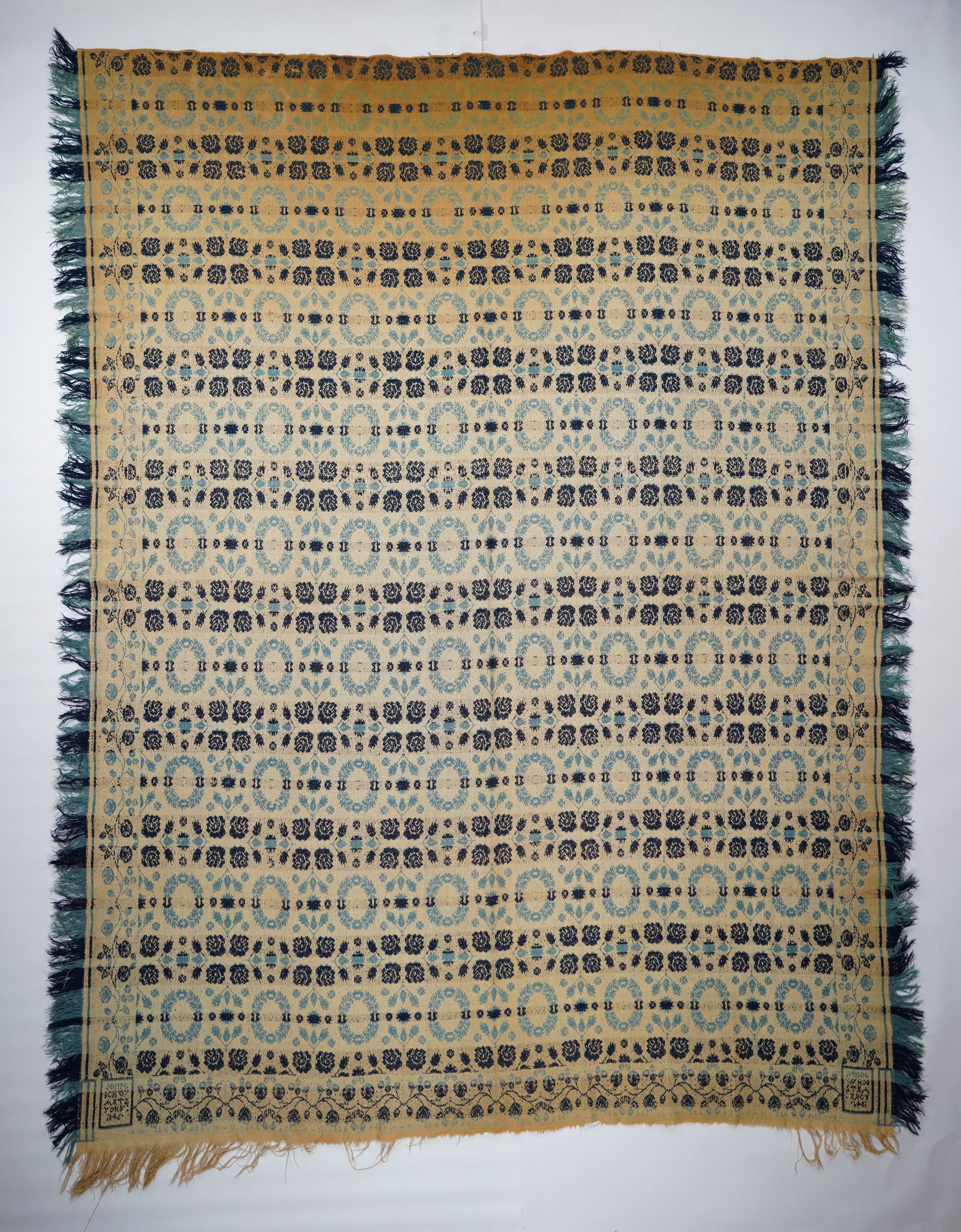 Blue, navy, and natural figured damask coverlet with border and self-fringe on three sides. Seamless. Woven by John Schwartz in York, York Co., Pennsylvania in 1846.Collection