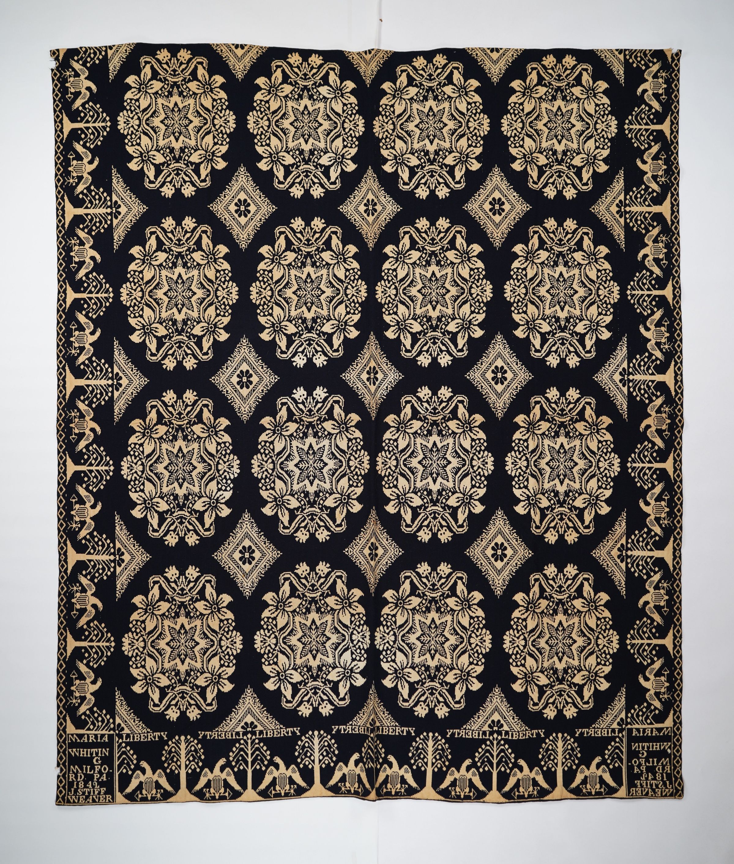 Navy and natural figured doublecloth coverlet with border on three sides. Two joined panels. Woven for Maria Whiting by John Stiff in Milford, Pike Co., Pennsylvania in 1842.Collection