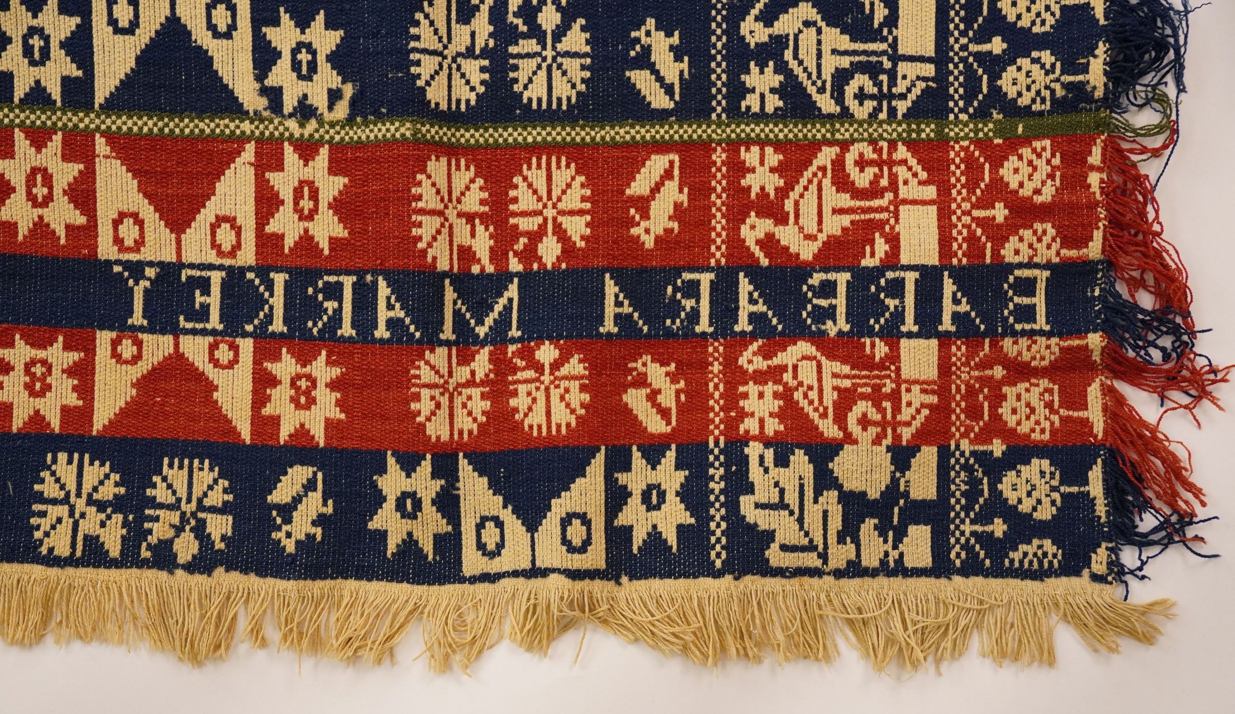 Red, navy, green, and natural figured tied half doublecloth coverlet with border and self-fringe on three sides. Two joined panels. Woven for Barbara Markey by John Wildin in York Co., Pennsylvania in 1838.Collection