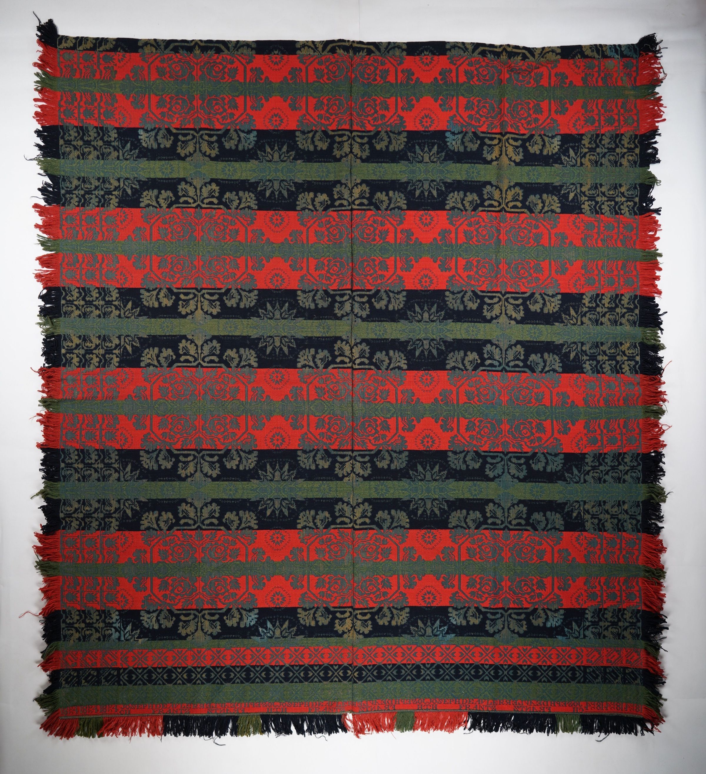 Figured and fancy tied beiderwand coverlet with borders on 3 sides and self-fringe on sides and applied fringe on bottom. Two panels joined by a center seam. Navy, red, and green wool with light blue cotton. Floral medallion centerfield pattern; abstract border on sides and bottom. Woven by Joseph Deavler for C.H Frantz in 1854.Context