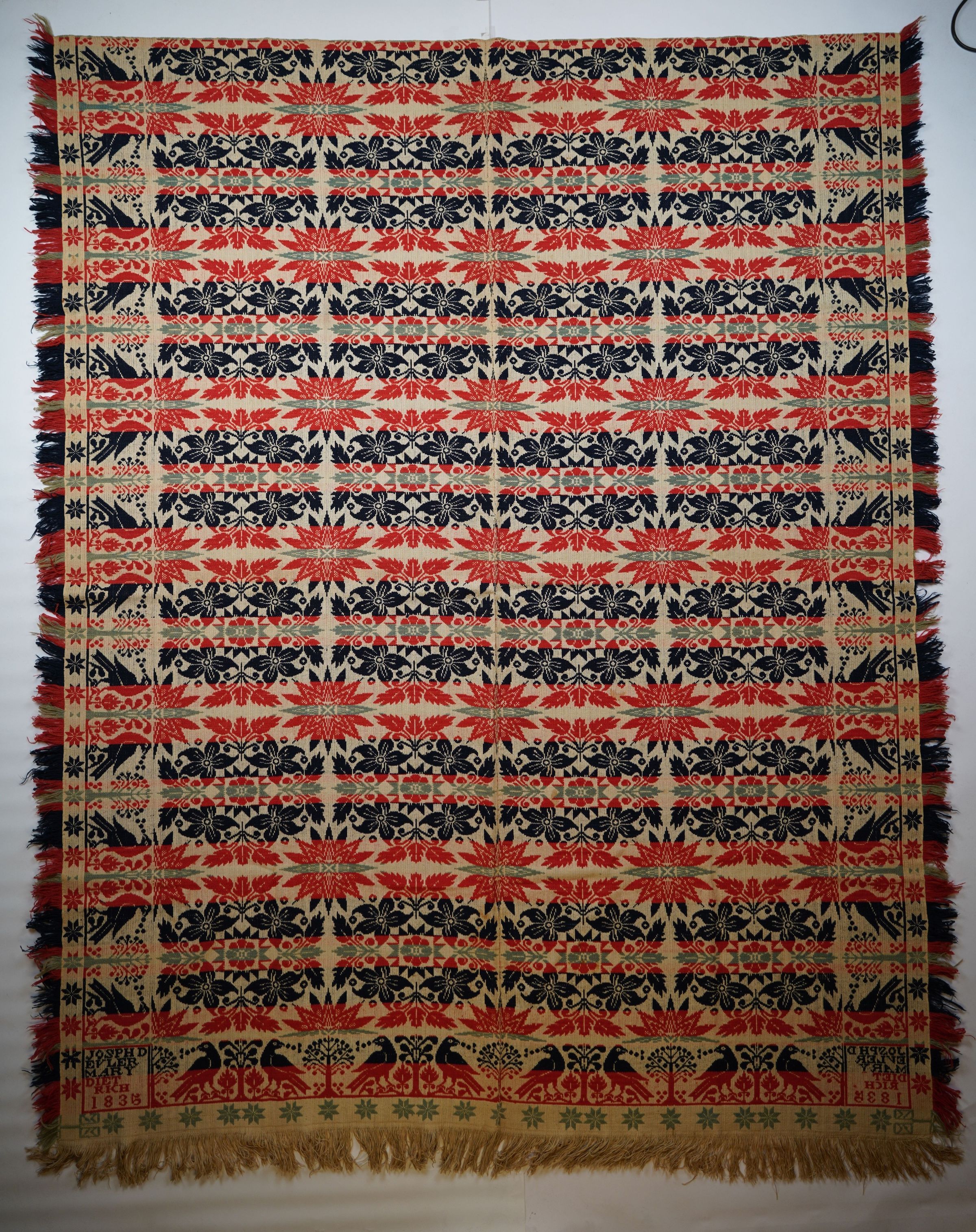 Green, red, navy, and natural figured tied half doublecloth coverlet with border and self-fringe on three sides. Two joined panels. Woven for Mary Dietrich by Joseph Dealer (Deavler) in Lancaster Co., Pennsylvania in 1835.Collection