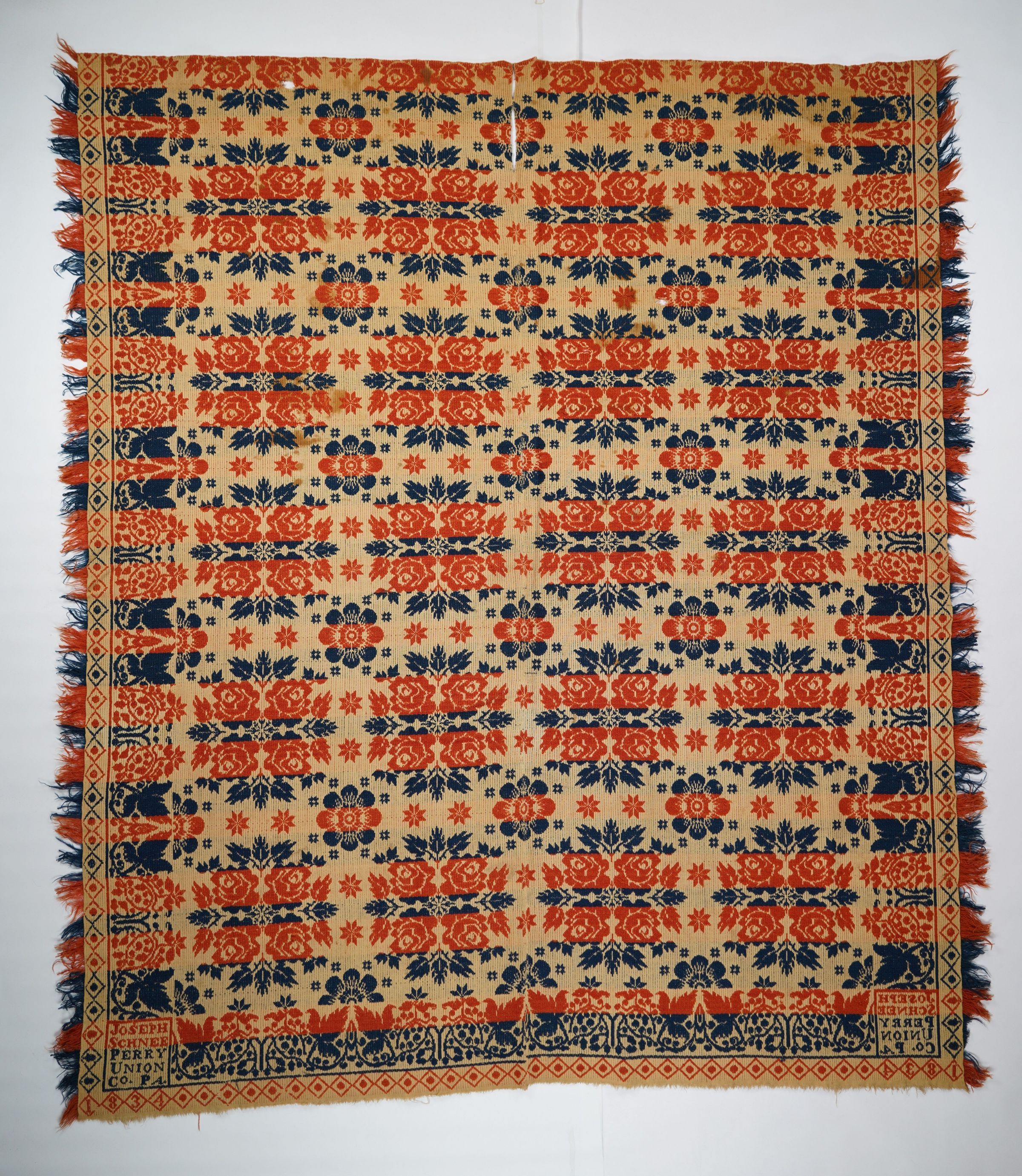 Red, navy, and natural figured tied half doublecloth coverlet with border and self-fringe on three sides. Two joined panels. Woven by Joseph Schnee in Perry Township Snyder Co. (formerly Union Co.), Pennsylvania in 1834.Collection