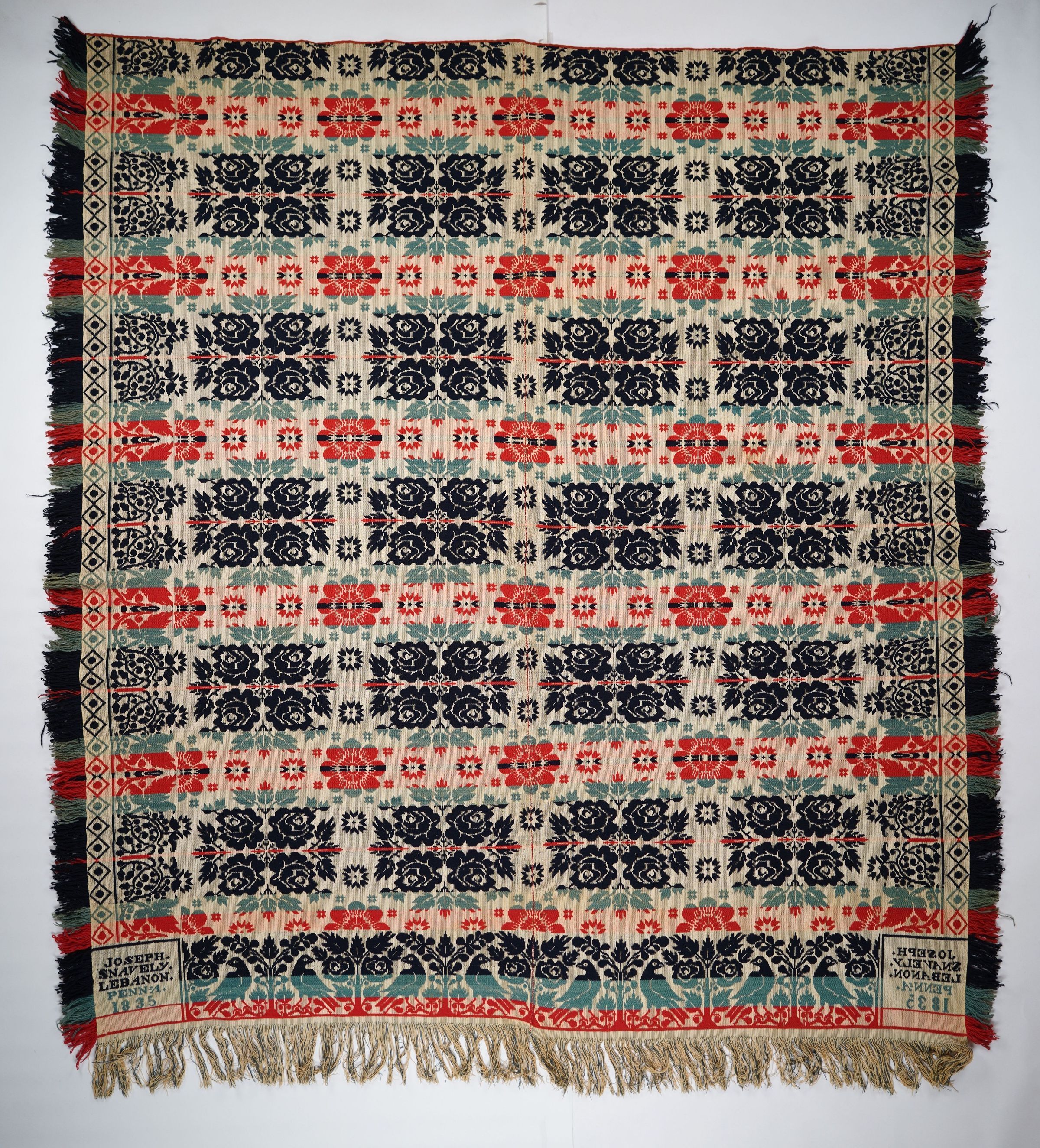 Blue, navy, red, and natural figured tied half doublecloth coverlet with border and self-fringe on three sides. Two joined panels. Woven by Joseph Snavely in Lebanon Co., Pennsylvania in 1835.Collection