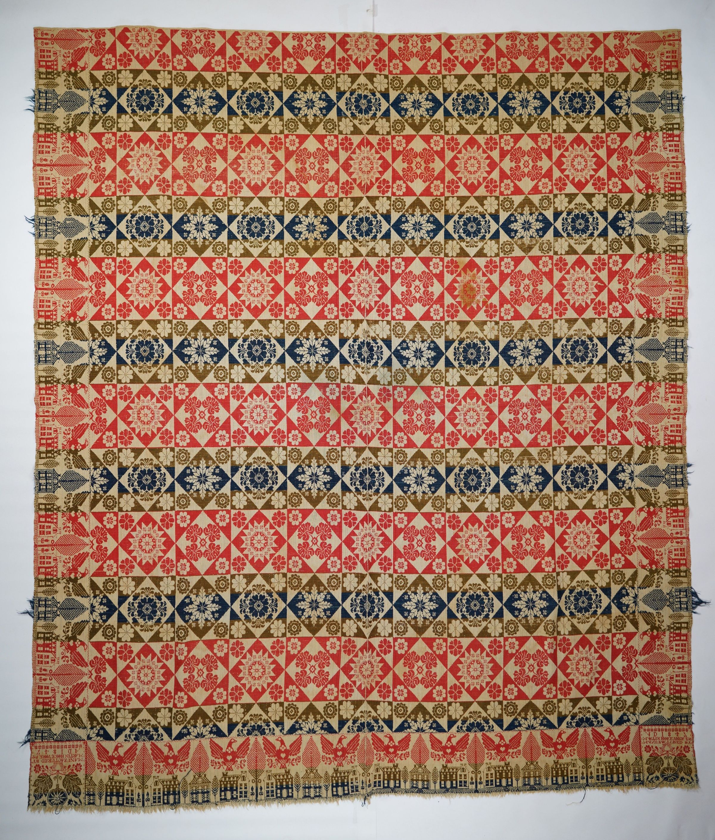 Red, olive, navy, and natural figured tied half doublecloth coverlet with border on three sides. Two joined panels. Woven by Martin Hoke in York Co., Pennsylvania in 1847.Collection