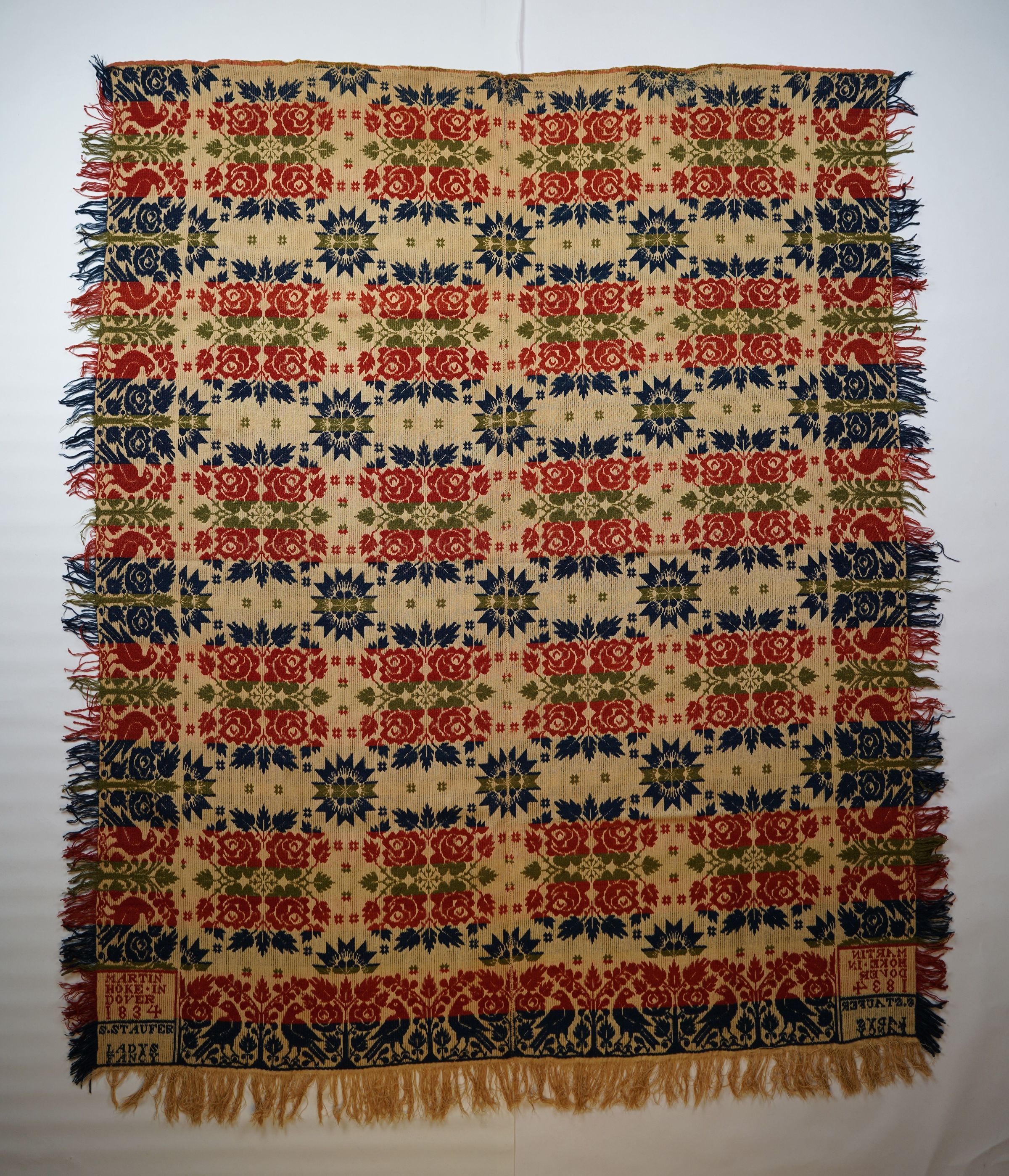 Green, red, navy, and natural figured tied half doublecloth coverlet with border and self-fringe on three sides. Two joined panels. Woven for S. Staufer by Martin Hoke in Dover, York Co., Pennsylvania in 1834.Collection