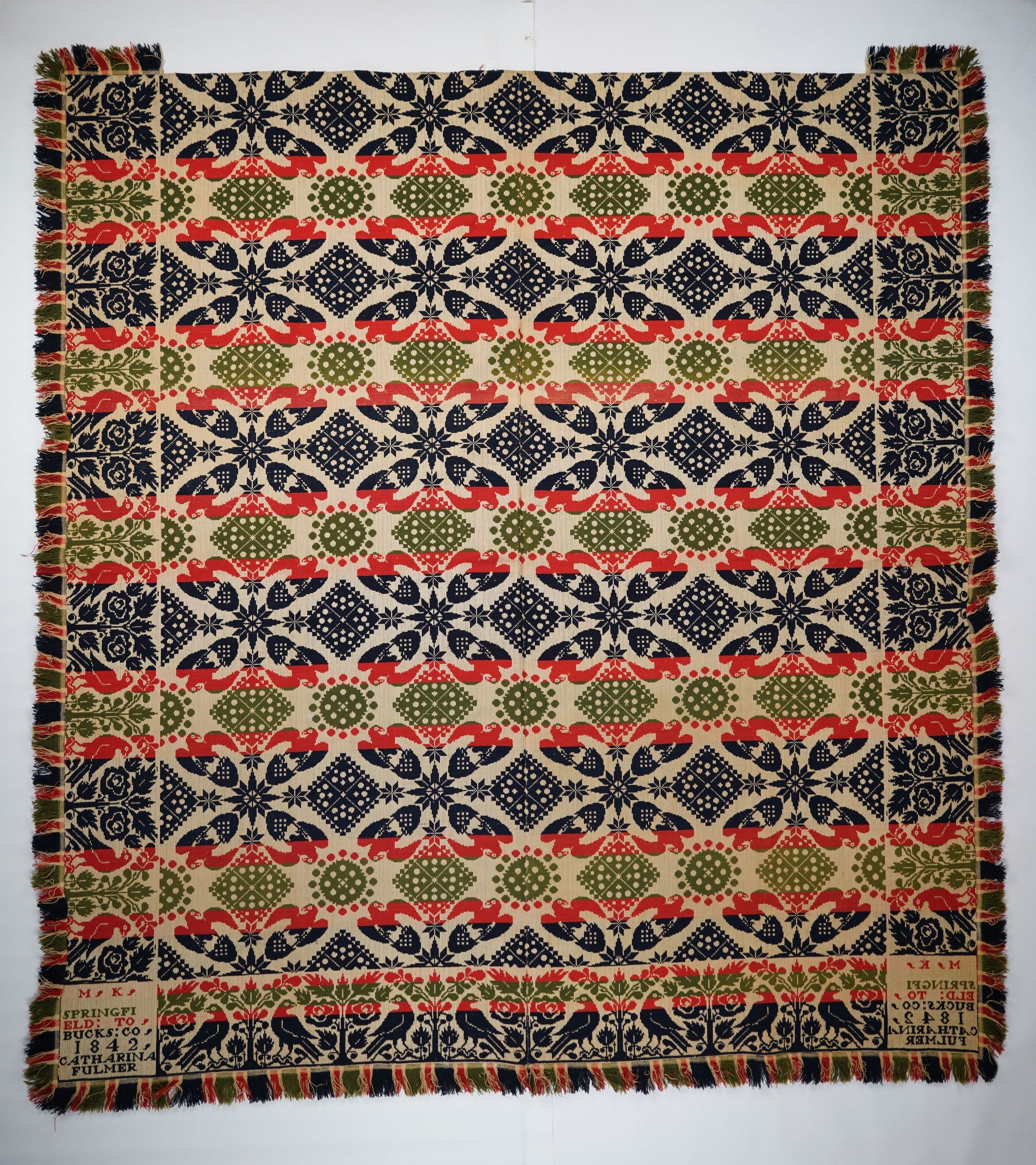 Red, green, navy, and natural coverlet with border on three sides and applied fringe on four sides. Two joined panels. Woven for Catharina Fulmer by Michael Kaufman in Springfield Twp., Bucks Co., Pennsylvania in 1842.Collection