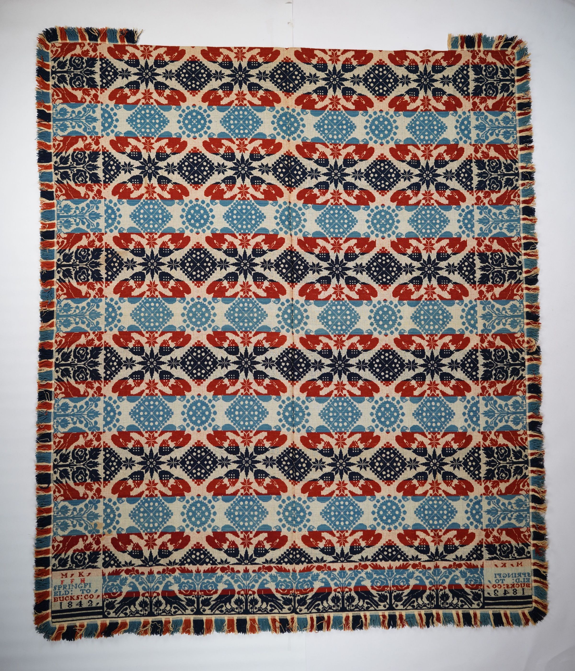 Red, blue, navy, and natural coverlet with border on three sides and applied fringe on four sides. Two joined panels. Woven for F. F. H. by Michael Kaufman in Springfield Twp., Bucks Co., Pennsylvania in 1842.Collection