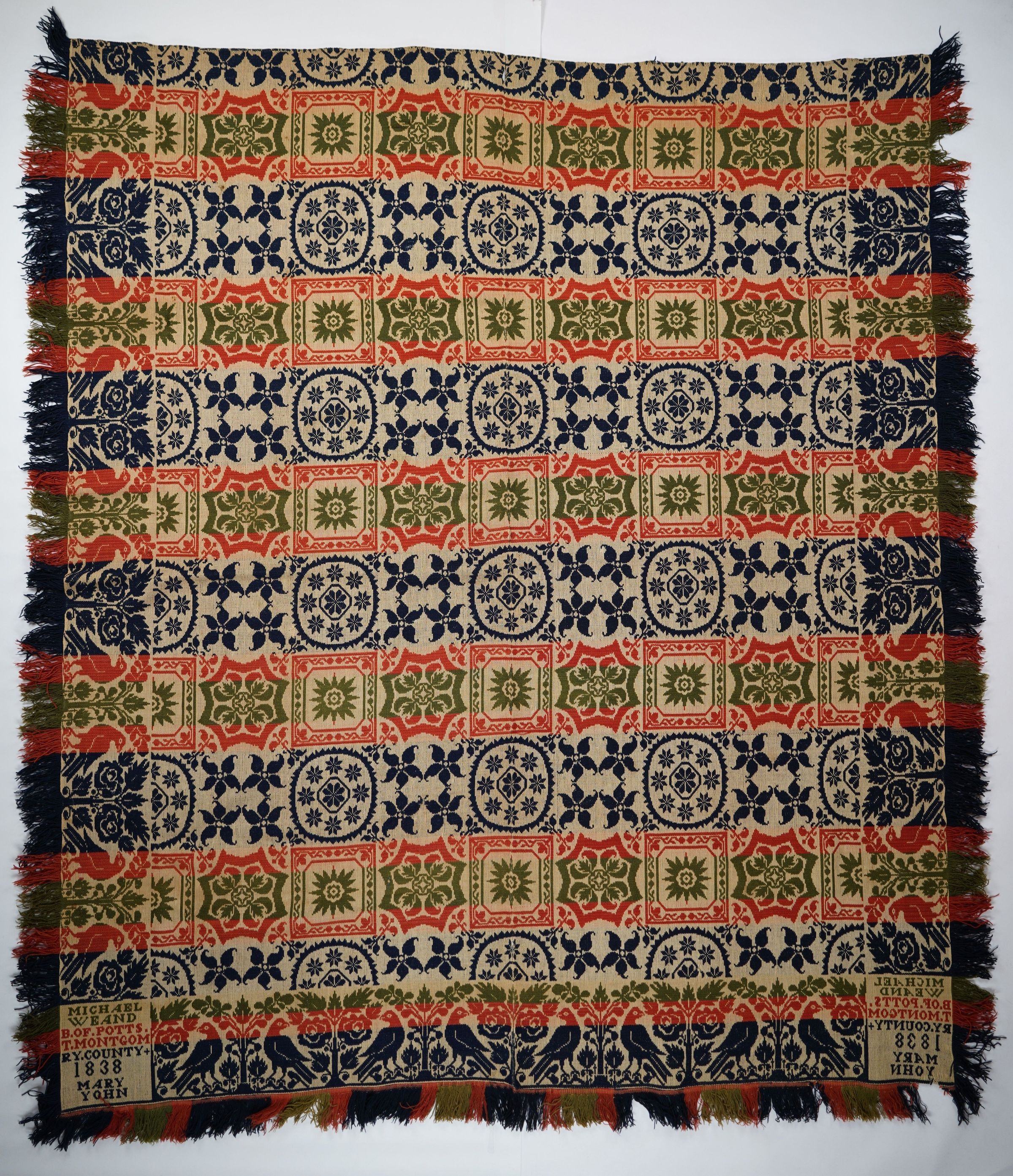 Red, green, navy, and natural figured tied half doublecloth coverlet with border and fringe on three sides. Two joined panels. Woven for Mary Yohn by Michael Weand in Pottstown, Montgomery Co., Pennsylvania in 1838.Collection