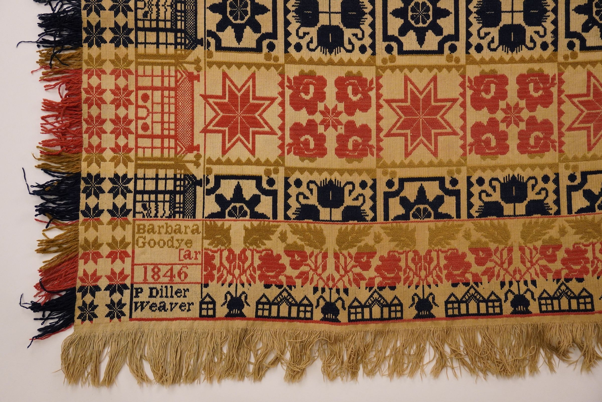 Pennsylvania coverlet by Peter Diller for Barbara Goodyear, 1846, tied beiderwandDescription
