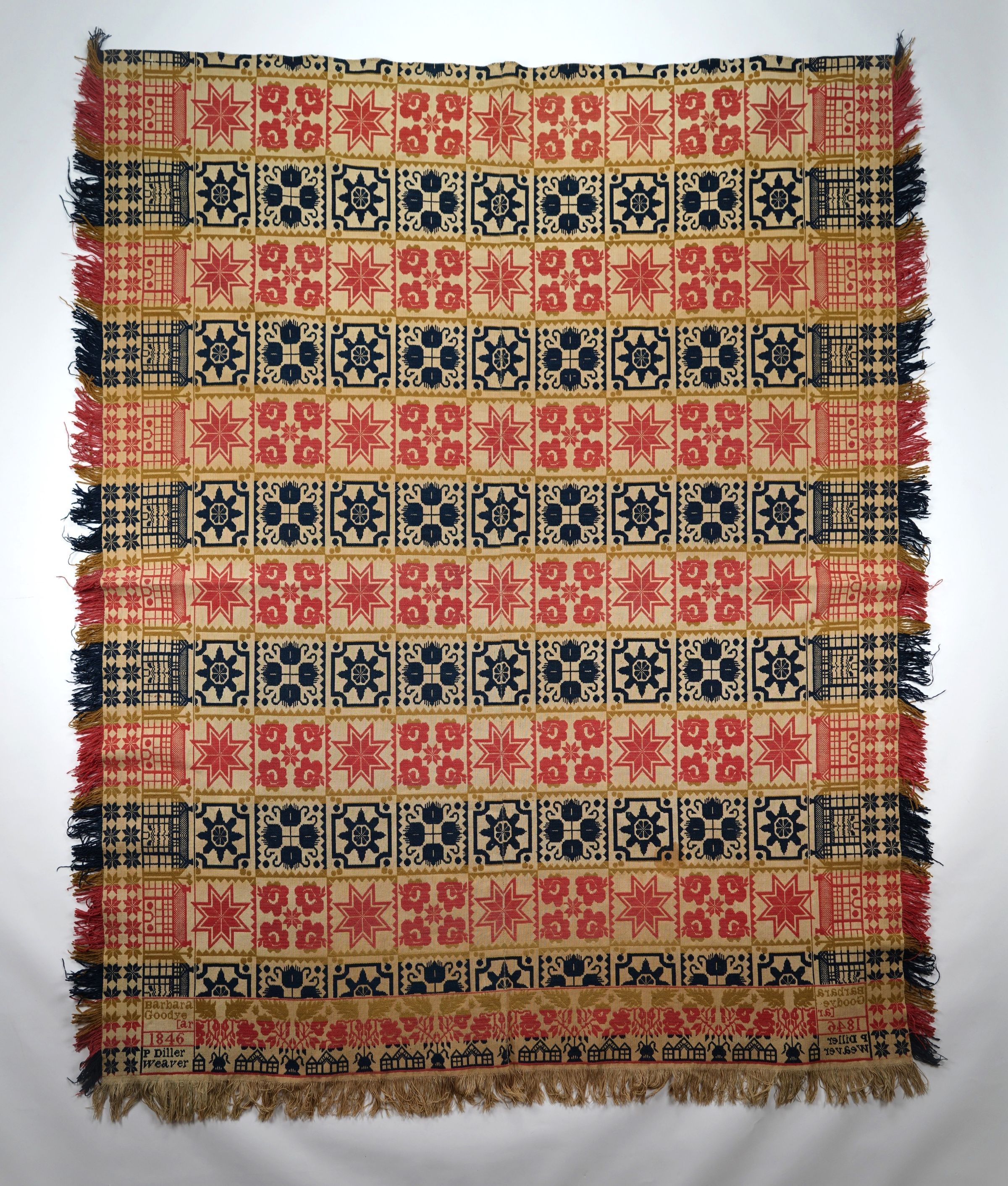 Red, navy, gold, and natural figured tied half doublecloth coverlet with border and fringe on three sides. Two joined panels. Woven by Peter Diller for Barbara Goodyear in Pennsylvania in 1846.Collection