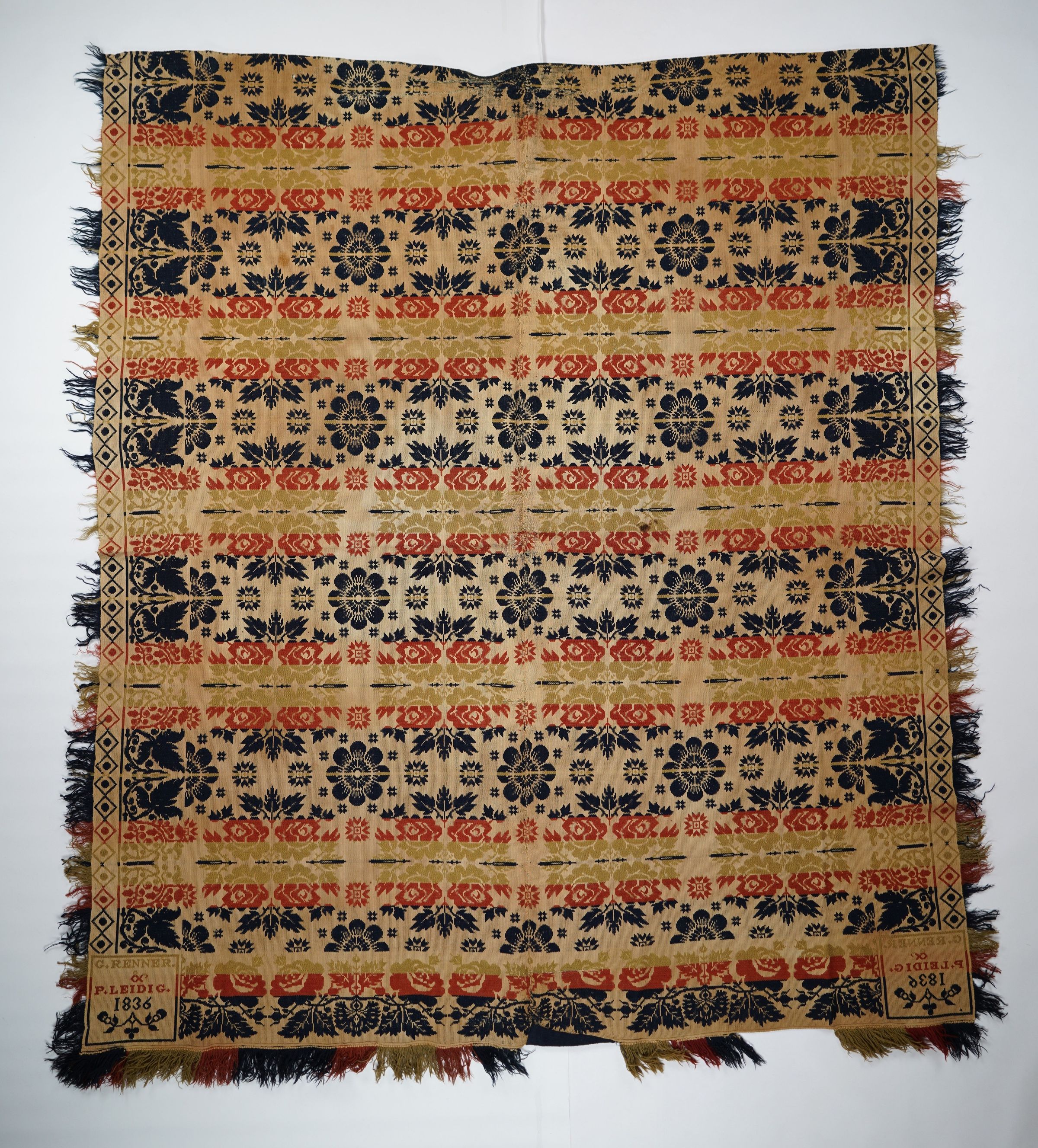 Yellow, red, navy, and natural figured tied half doublecloth coverlet with border and fringe on three sides. Seamless. Woven by George Renner and Peter Leidig in Schaefferstown, Heidelberg Twp., Lebanon Co., Pennsylvania in 1836.Collection