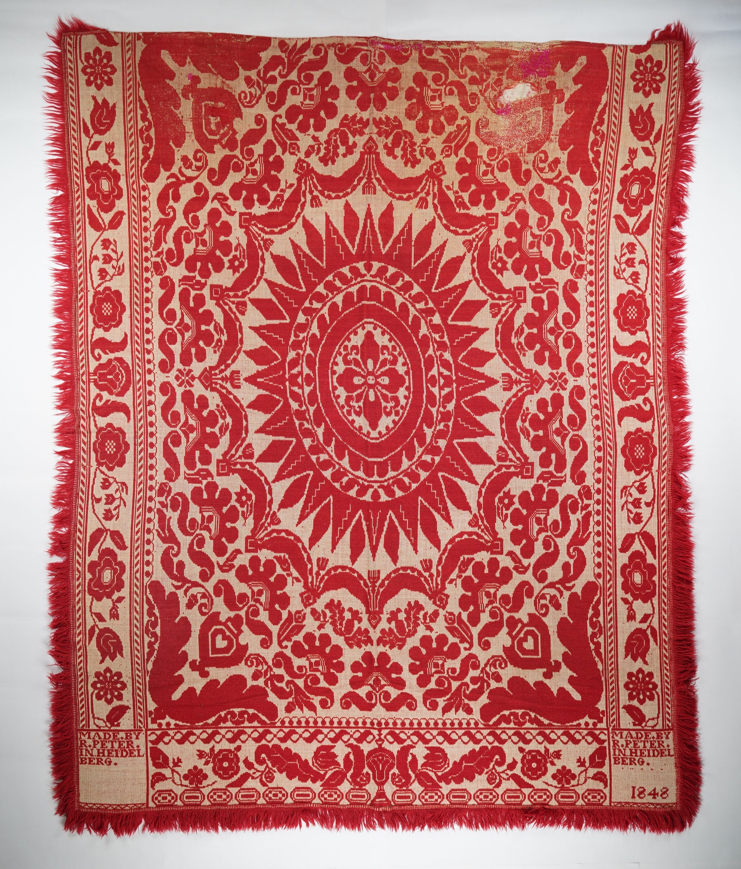 Red and natural figured tied beiderwand coverlet with border and fringe on three sides. Seamless. Woven by Reuben Peter in 1848 in Heidelberg Twp., Lehigh Co., Pennsylvania.Context