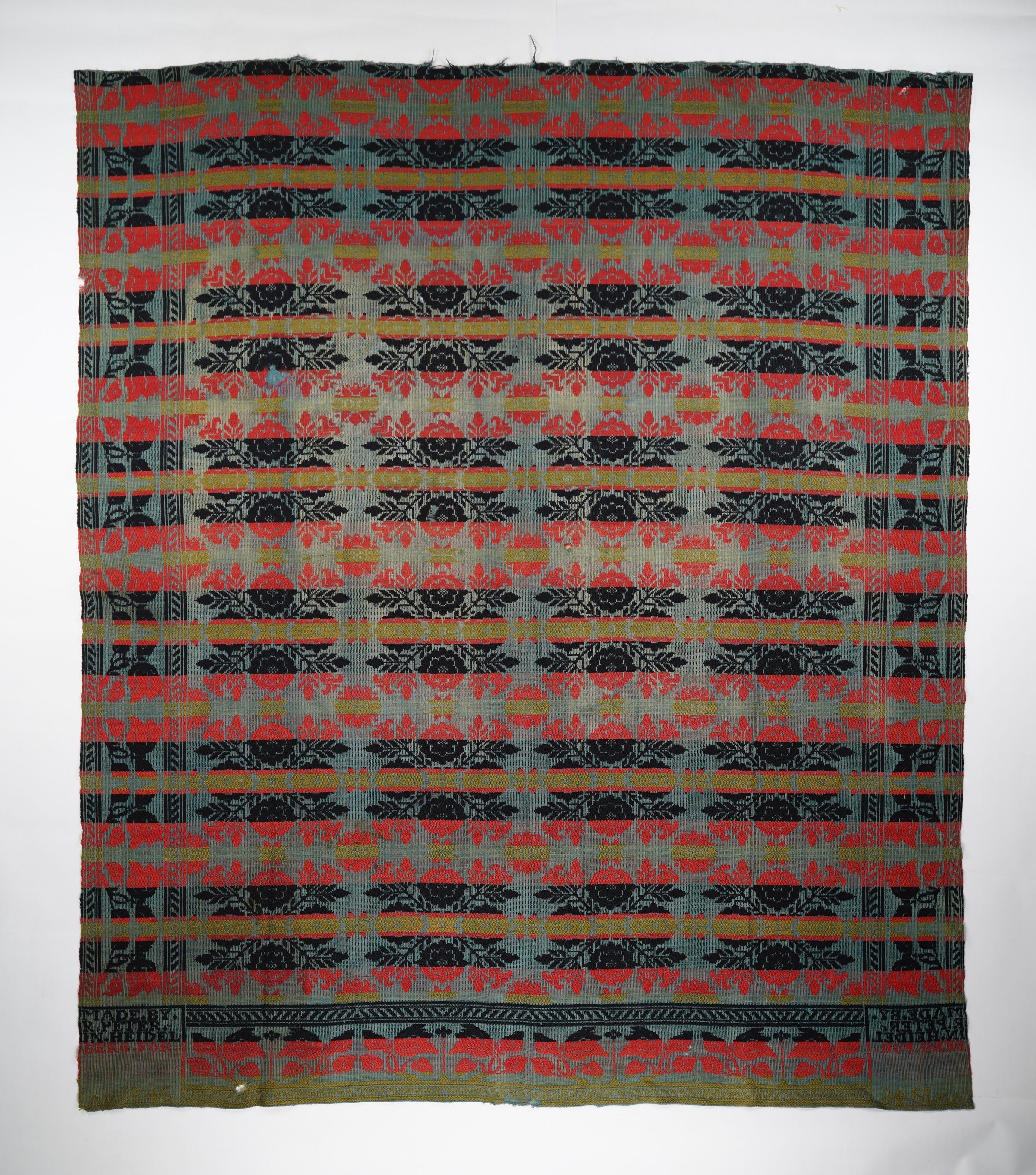 Light blue, red, green, and navy figured tied beiderwand coverlet with border on three sides. Seamless. Woven by Reuben Peter in Heidelberg Twp., Lehigh Co., Pennsylvania in 1845Context