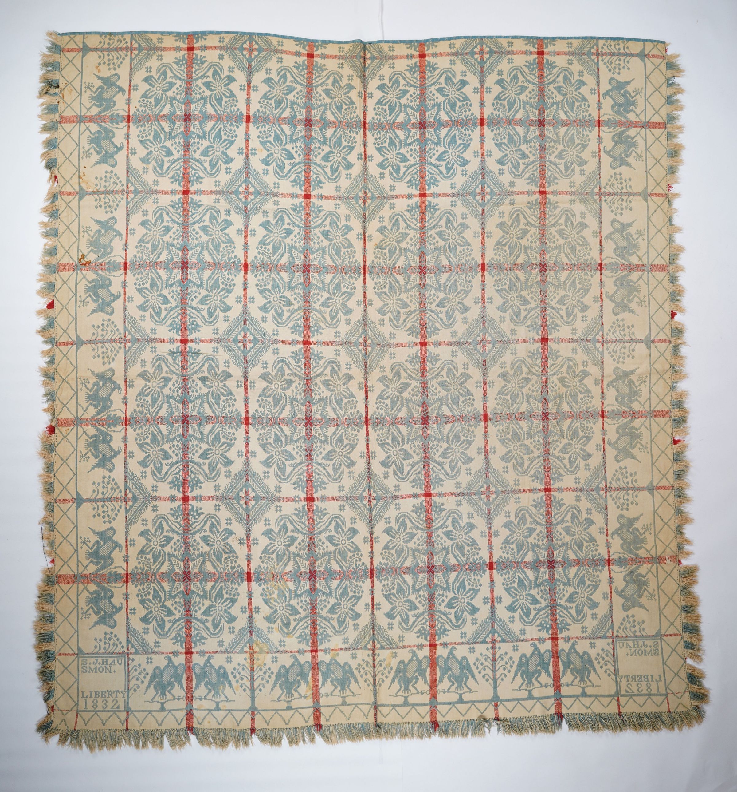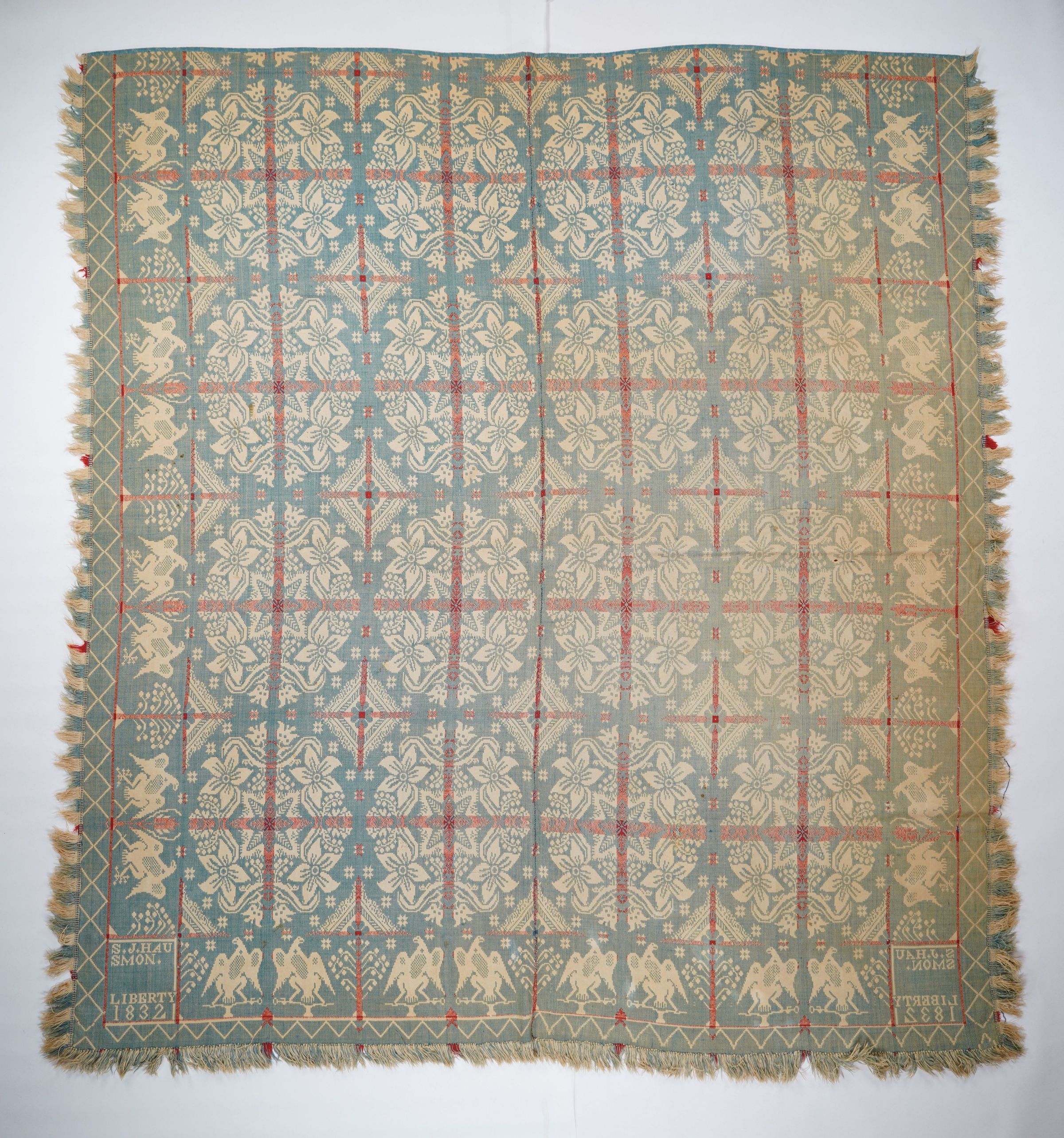 Red, blue, and natural figured doublecloth coverlet with border and self-fringe on three sides. Two joined panels. Likely woven by S. & J. (Solomon and Jacob Mosher) Hausmon/Hausman in Lehigh Co., Pennsylvania in 1832.Collection