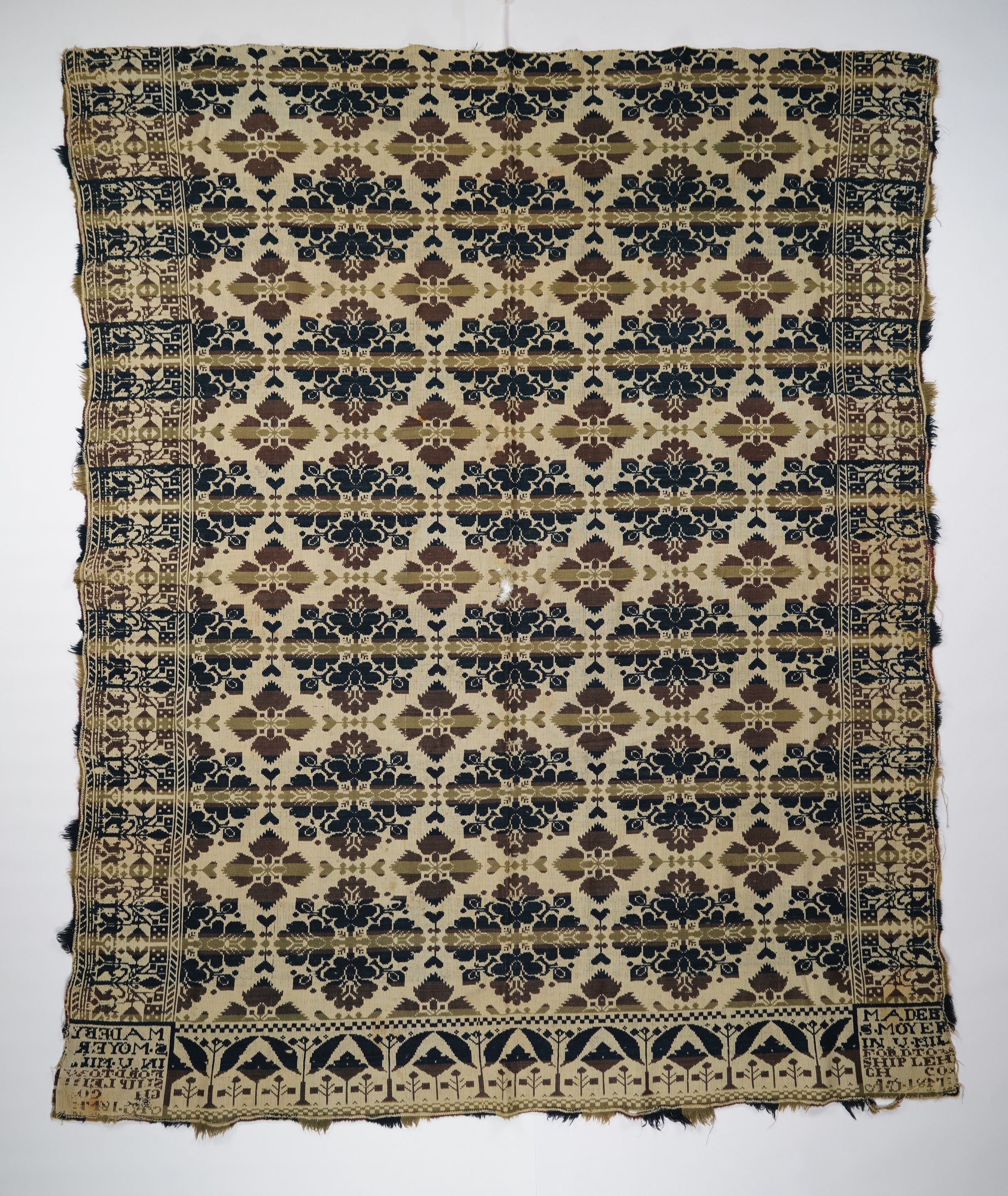 Green, olive, navy, and natural figured tied half doublecloth coverlet with border on three sides. Two joined panels. Woven by S. Moyer in Upper Milford Twp., Lehigh Co., Pennsylvania in 1847.Collection