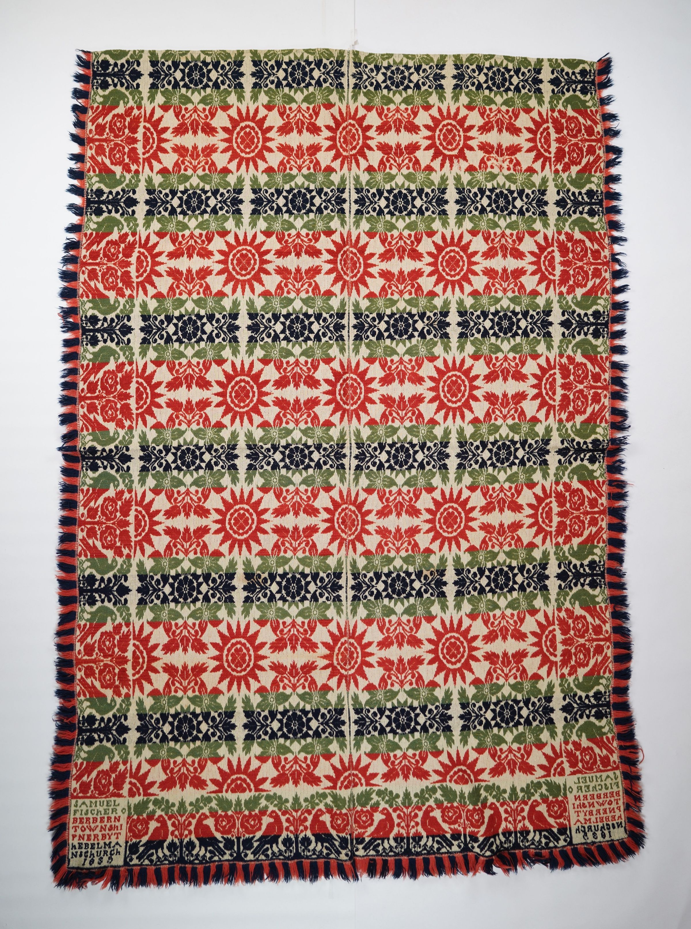 Green, red, navy, and natural figured tied half doublecloth coverlet with border and applied fringe on three sides. Two joined panels. Woven by Samuel Fischer in Bern Twp., Berks Co., Pennsylvania in 1835. "Nerby the Belmans Church" refers to Belleman's Union Church in Centre Twp., Pennsylvania (see below).Collection