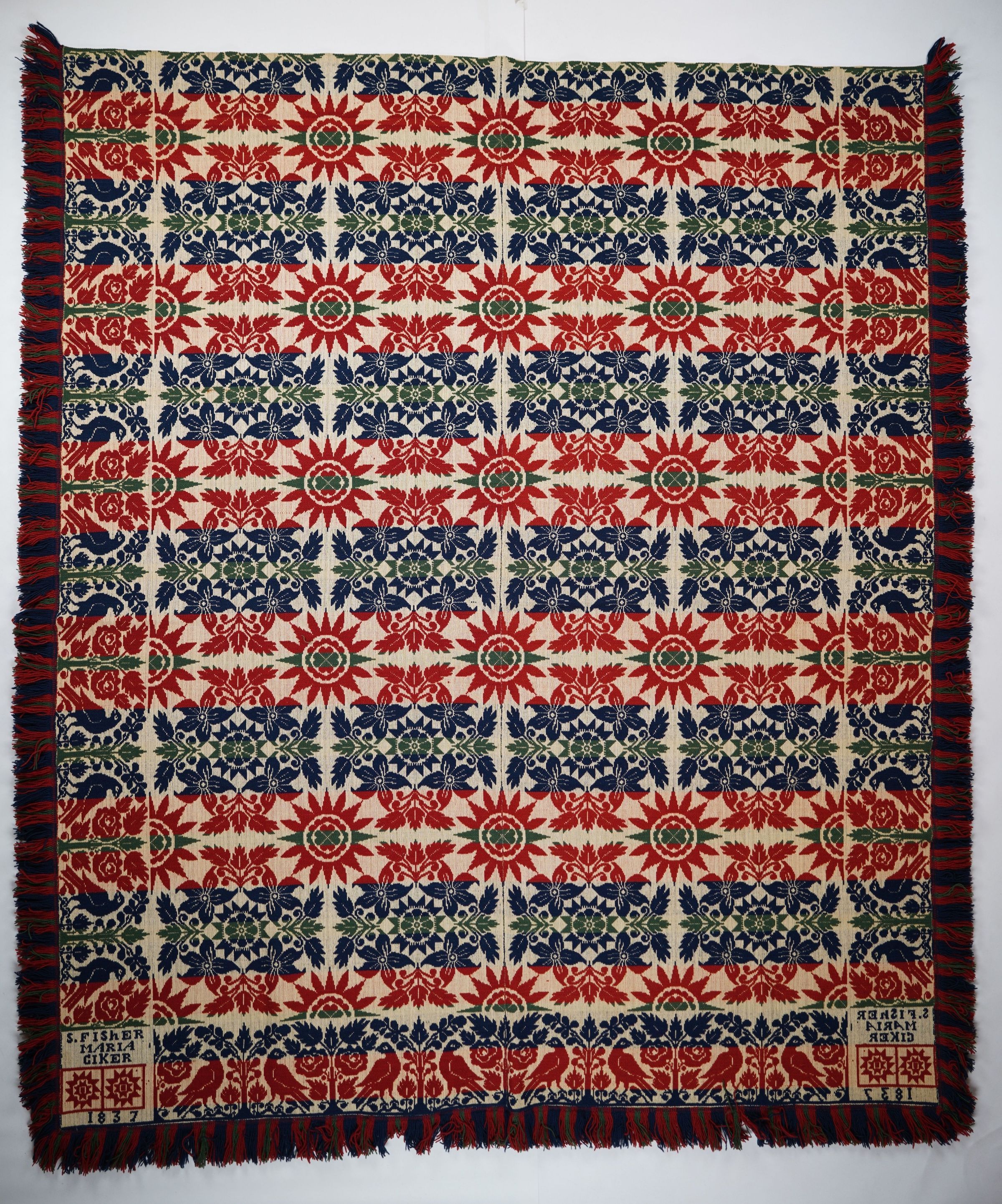 Green, red, navy, and natural figured tied half doublecloth coverlet with border and applied fringe on three sides. Two joined panels. Woven for Maria Giker by Samuel Fischer in Pennsylvania in 1837.Collection