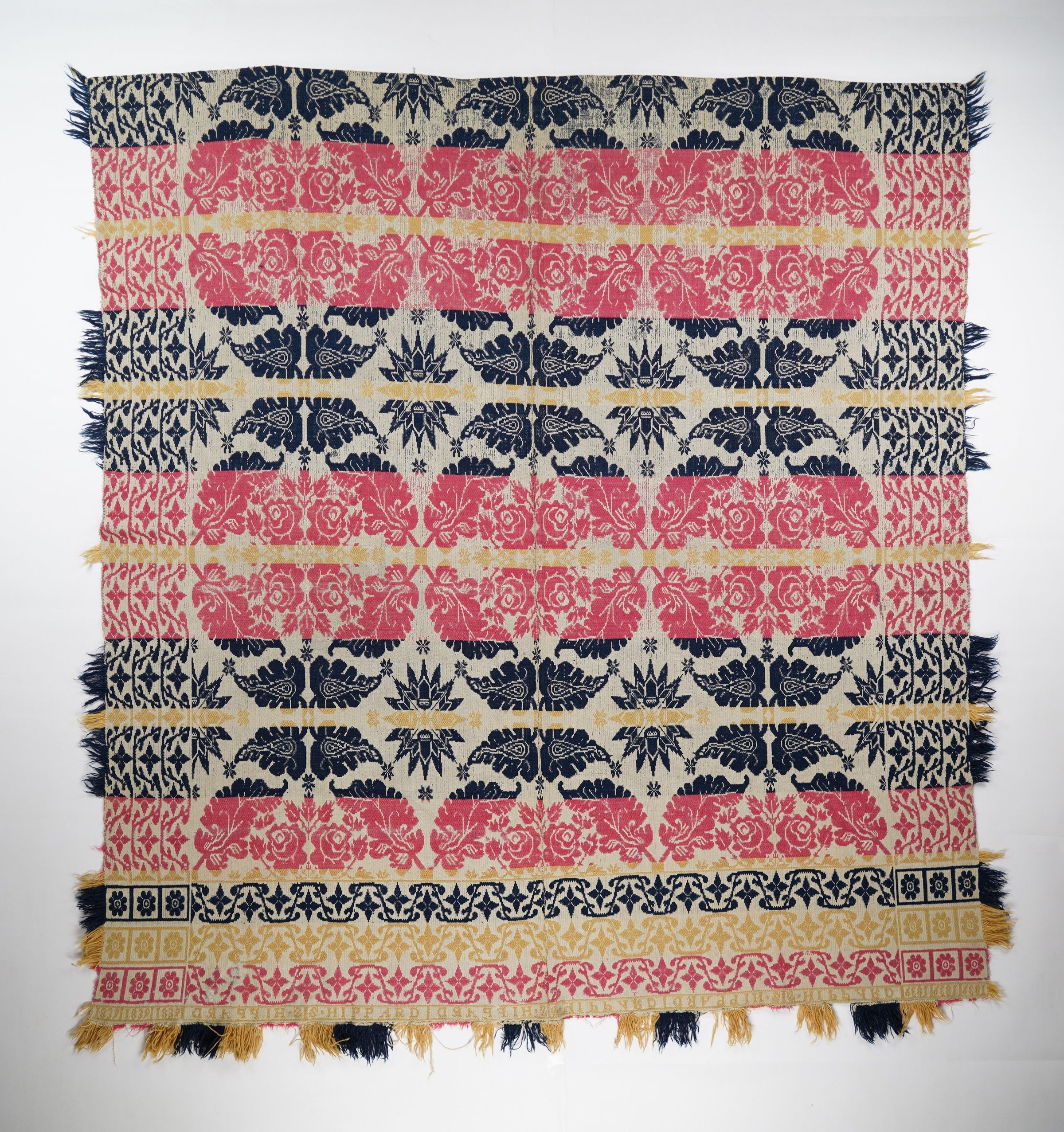 Figured and fancy tied beiderwand coverlet with borders on 3 sides and self-fringe on the sides and applied fringe on the bottom. Two panels joined by a center seam. Navy, red, and yellow wool with undyed cotton. Double rose centerfield pattern; vine border on sides and bottom. Woven by Samuel Hippard in 1839 with nine flower logo in cornerblock.Context