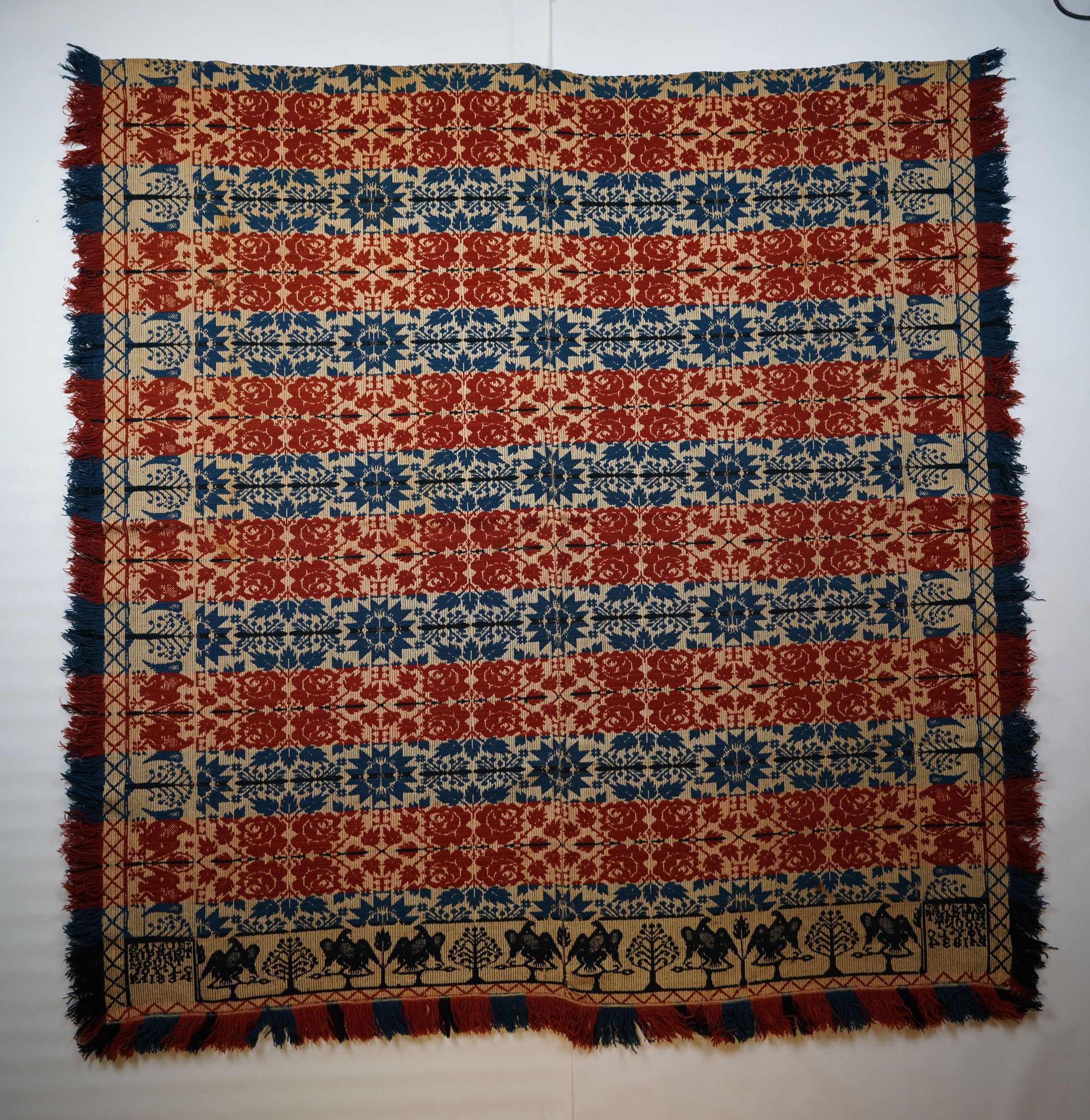 Red, blue, navy, and natural figured tied half doublecloth coverlet with border and fringe on three sides. Two joined panels. Woven by Samuel Hippert (Hippart) in Mount Joy, Lancaster Co., Pennsylvania in 1834.Collection