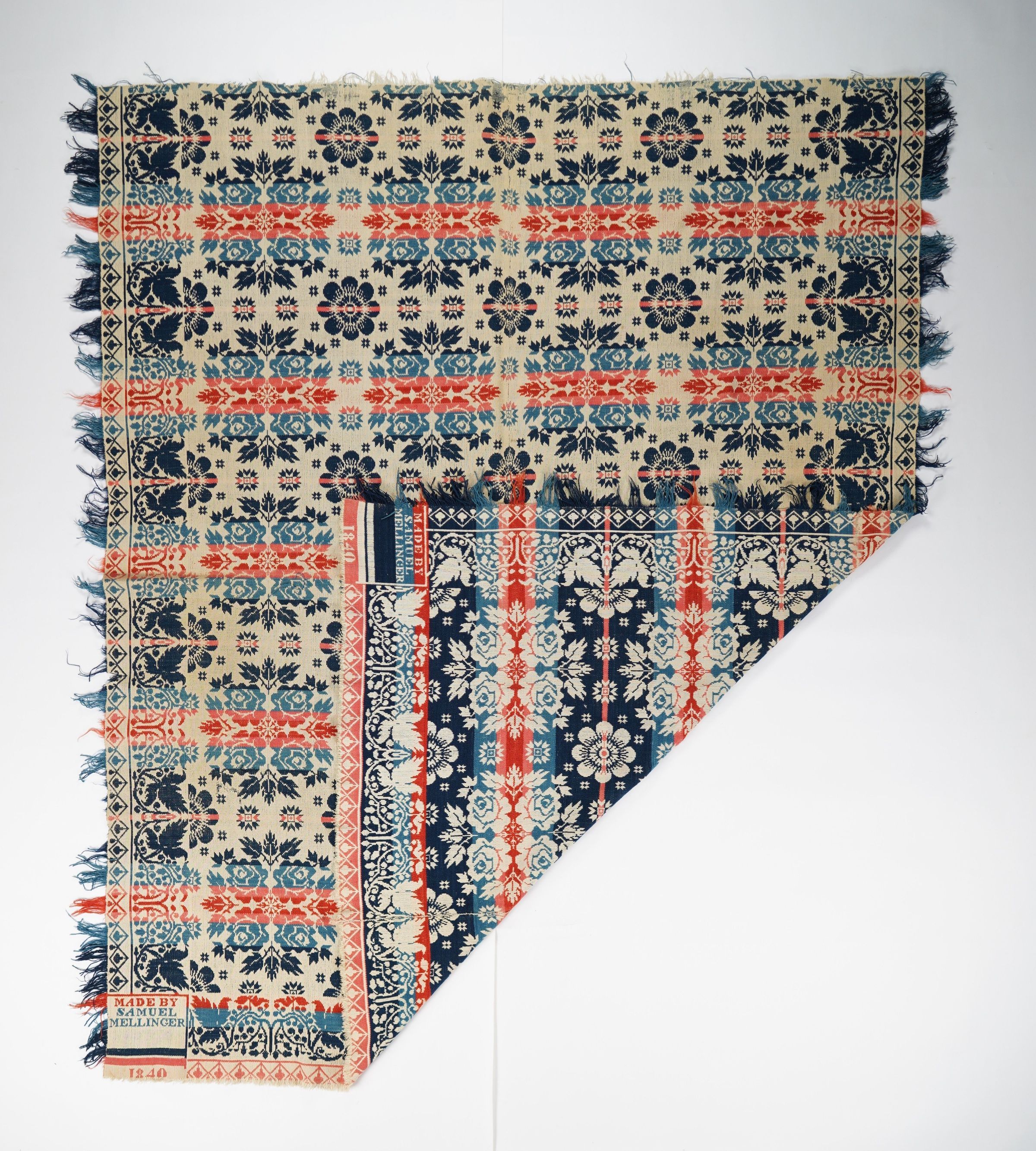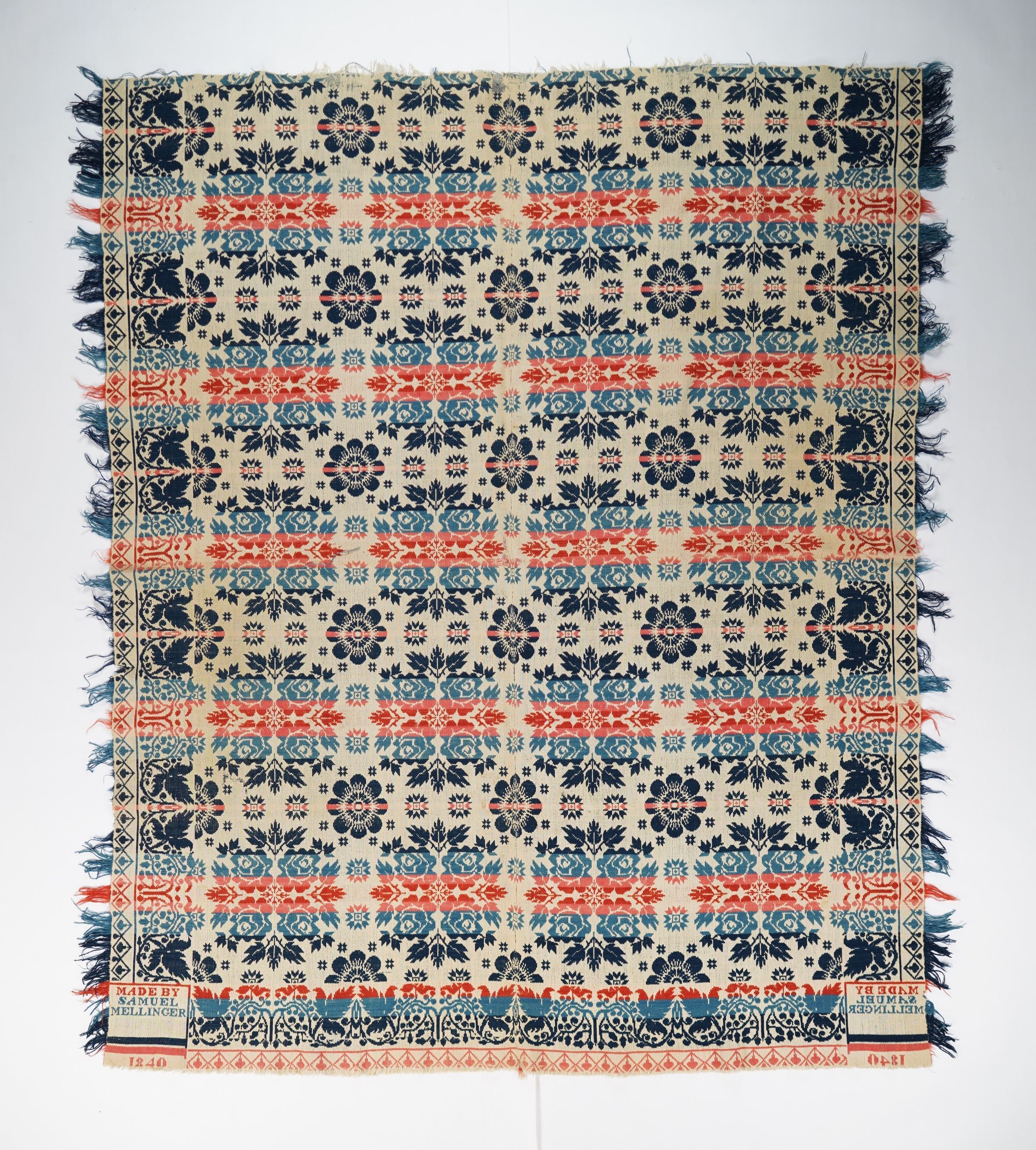 Red, pink, bright blue, navy blue, and natural figured tied Beiderwand coverlet with grapevine borders and self-fringe on three sides. Woven by Samuel Mellinger in 1840.Photograph Details