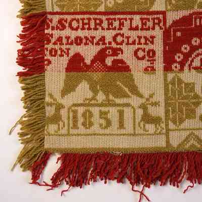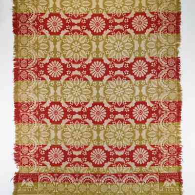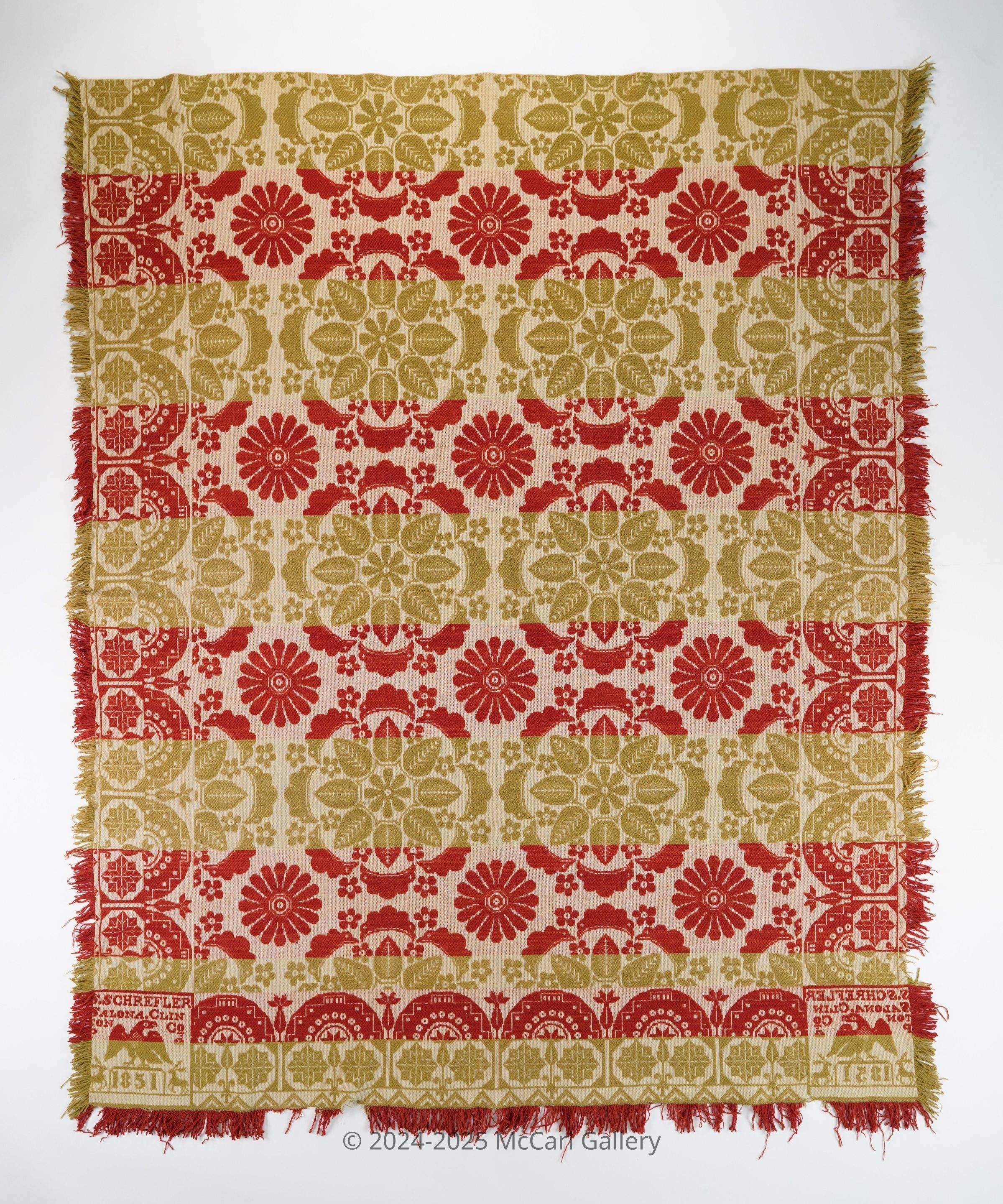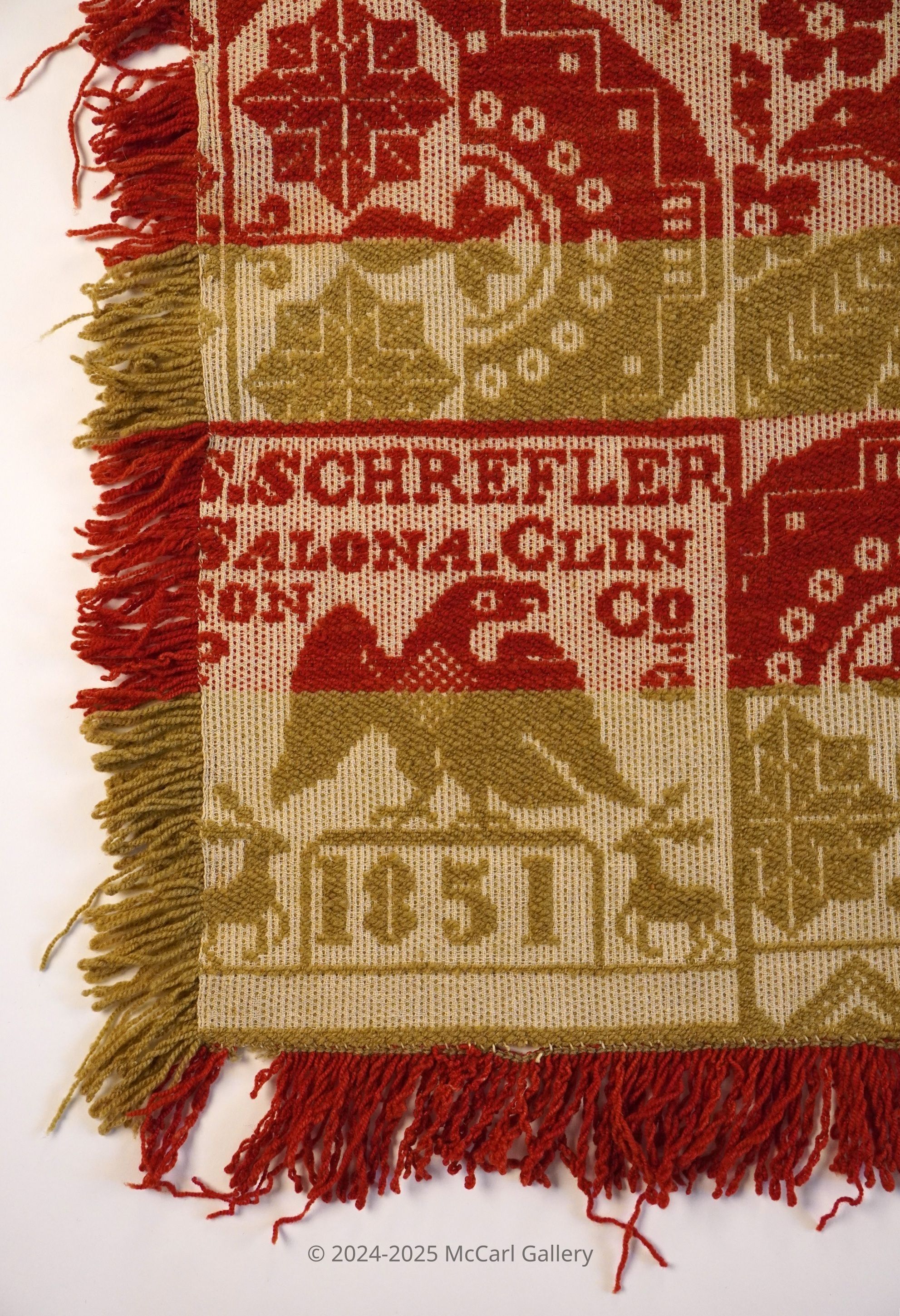Figured and fancy tied beiderwand coverlet with borders on 3 sides and self-fringe on sides and applied fringe on bottom. Woven full-width; seamless. Red and light green wool with undyed cotton. Leafy medallion centerfield pattern; elaborate abstract border on sides and bottom. Woven by Samuel Schreffler in 1851; cornerblock includes eagle and deer.Collection