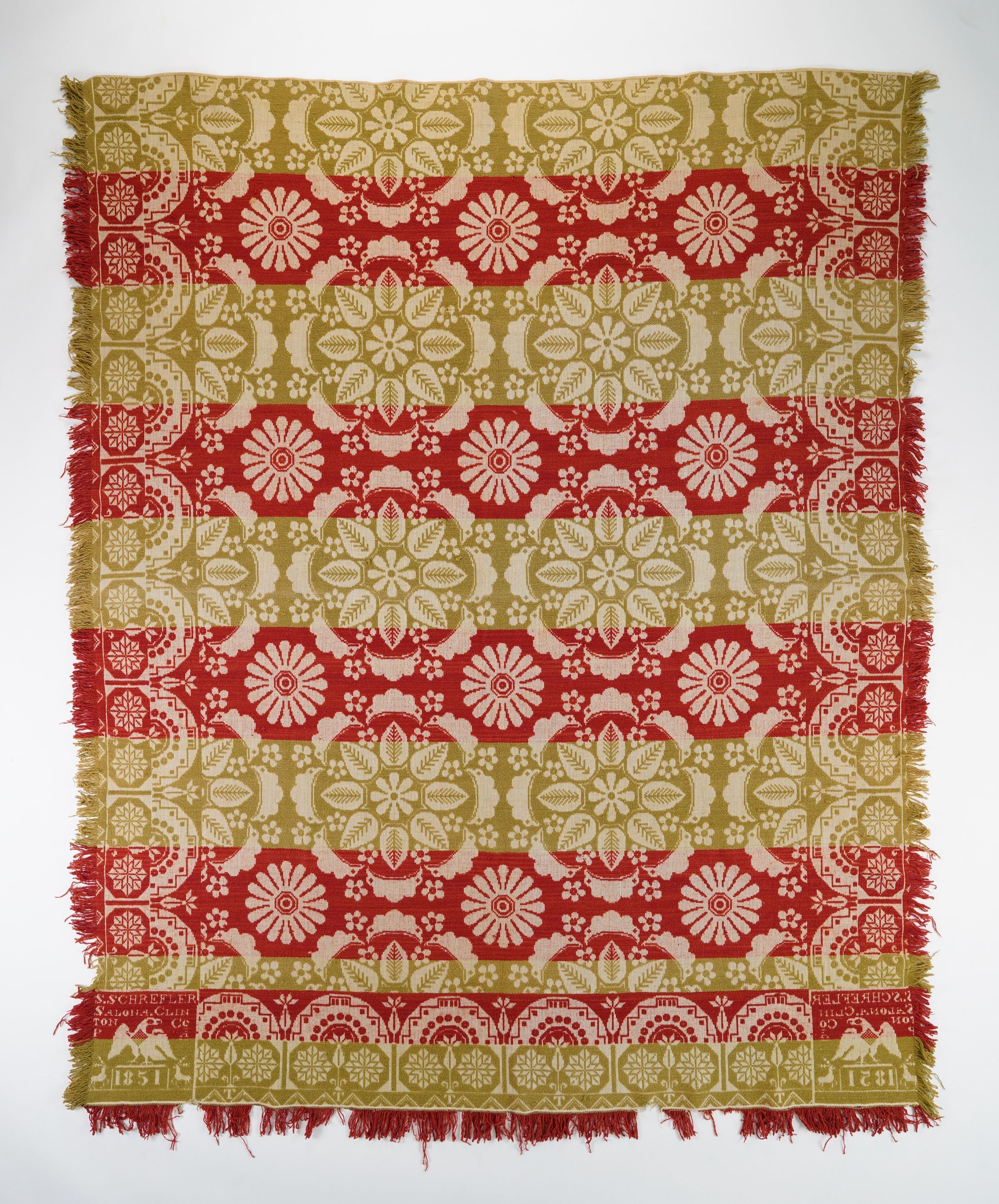 Figured and fancy tied beiderwand coverlet with borders on 3 sides and self-fringe on sides and applied fringe on bottom. Woven full-width; seamless. Red and light green wool with undyed cotton. Leafy medallion centerfield pattern; elaborate abstract border on sides and bottom. Woven by Samuel Schreffler in 1851; cornerblock includes eagle and deer.Context
