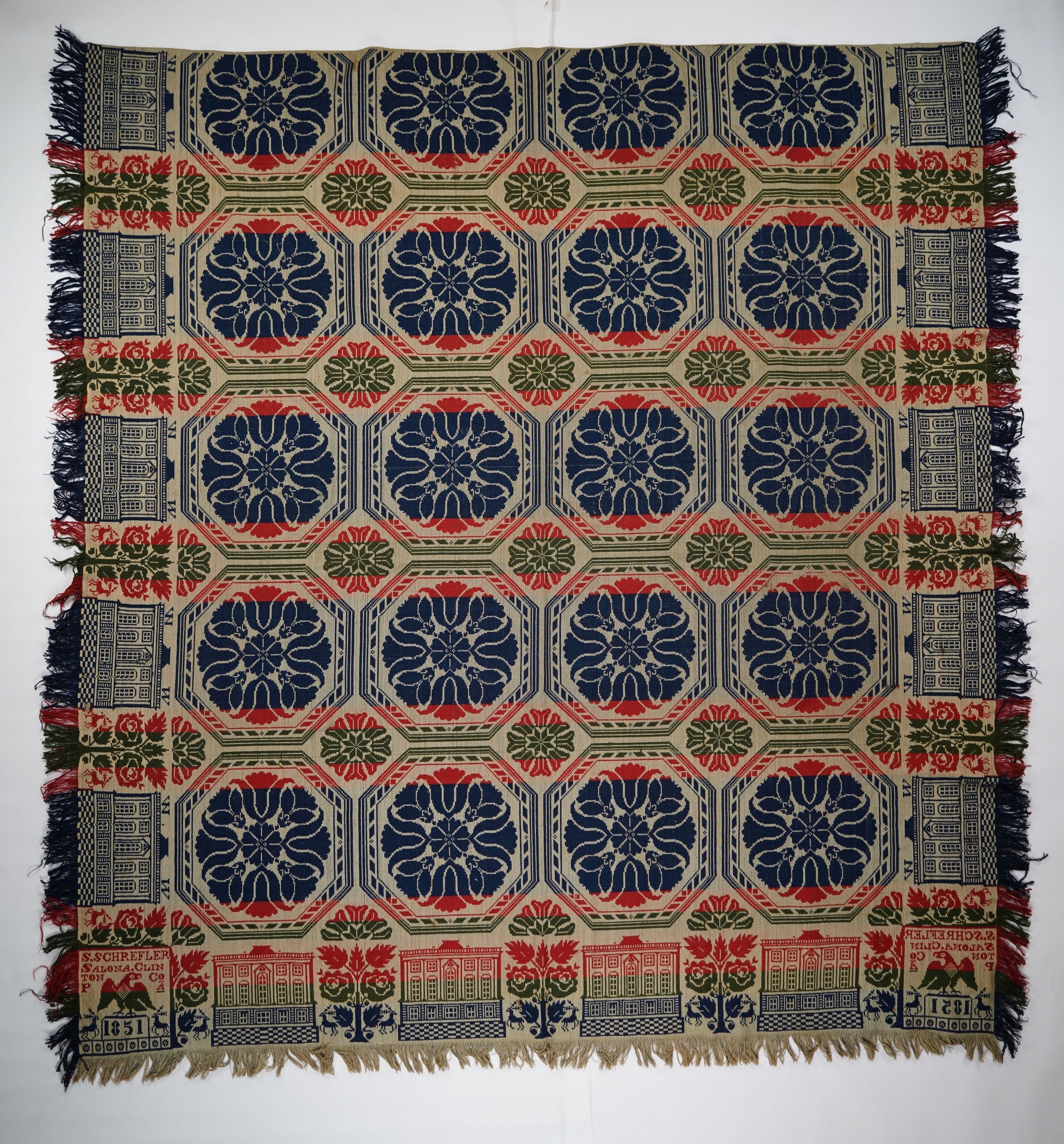 Red, green, navy, and natural figured tied half doublecloth coverlet with border and self-fringe on three sides. Seamless. Woven by Samuel Schrefler in Salona, Clinton Co., Pennsylvania in 1851.Collection