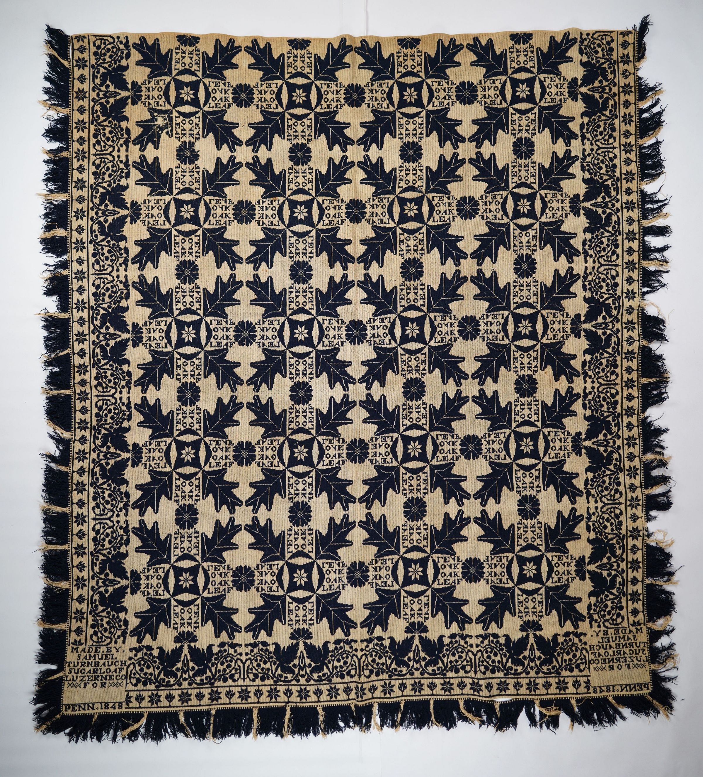 Navy and natural figured tied half doublecloth coverlet with border and applied fringe on three sides. Two joined panels. Woven by Samuel Turnbauch in Sugarloaf Twp., Luzerne Co., Pennsylvania in 1848.Collection
